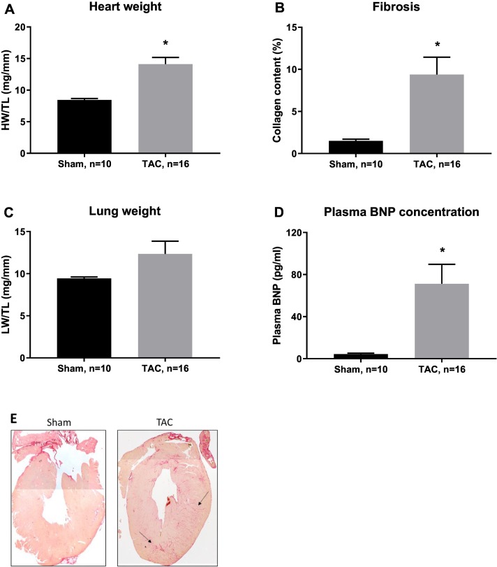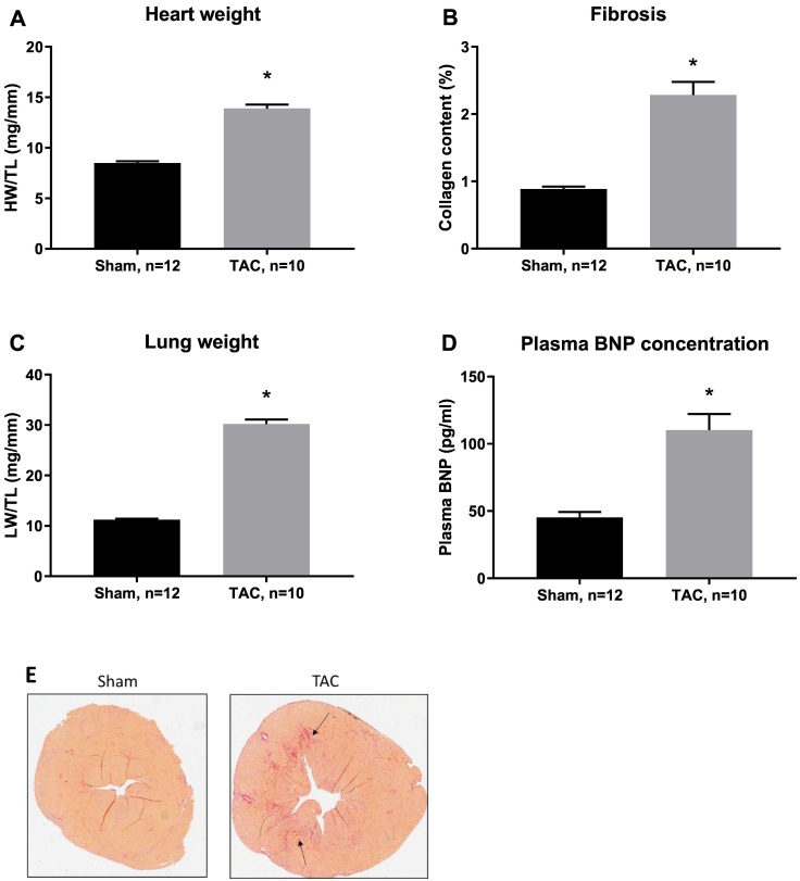 研究结束时,用2.5%异氟烷麻醉动物,并通过颈动脉放血。然后暴露胸腔,仔细检查以确定是否存在胸腔积液,胸腔积液的定义是液体积聚量大于30μl。采集心脏和肺,进行大体检查,并立即称重。将心脏切成两半,然后固定在10%中性缓冲福尔马林中,进行间质纤维化分析。解剖右胫骨,测量其长度(TL)并标准化心脏重量(HW)和肺部重量(LW)。 空气干燥约60小时后,再次测量LW。终点包括心脏功能和大小,肺水肿,胸腔积液,心房大小,生存率和血浆BNP浓度,以及器官重量和纤维化。如前所述,LW/TL比值高于假手术小鼠中观察到的最大值的TAC小鼠被视为具有HF表型。