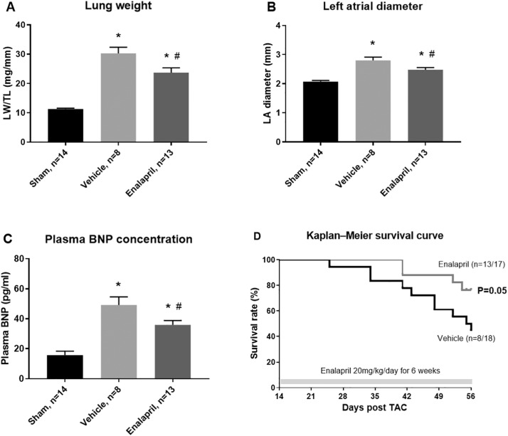 依那普利对BALB / c TAC模型中的治疗:TAC后两周,当确定心脏肥大时,通过皮下渗透泵施用依那普利(20 mg / kg /天,n = 17)或赋形剂(50%DMSO / 50%生理盐水,n = 18),持续6周。与赋形剂对照组相比,依那普利治疗显著降低HR。依那普利可降低TAC后的总死亡率、肺水肿、LA直径和血浆BNP浓度。假手术组未观察到死亡率。与赋形剂组相比,依那普利组的心功能无明显改善,左室壁厚度、左室容积、HW/TL比值或间质胶原含量无明显降低。