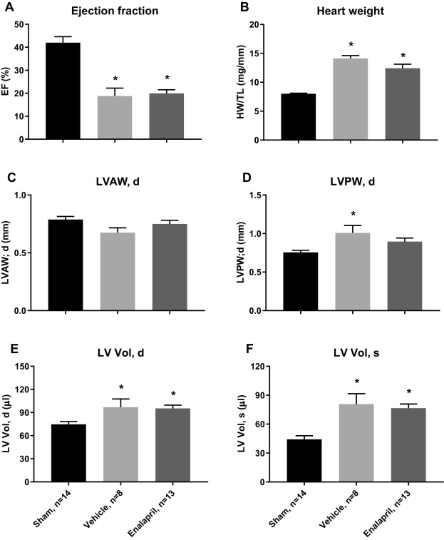 图7.依那普利对BALB / c TAC模型收缩功能,左心室壁厚度和体积以及心脏重量的影响。