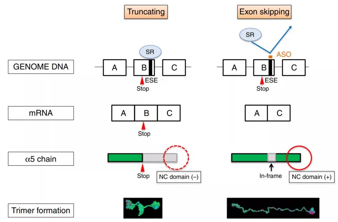 2. Yamamura T, Horinouchi T, Adachi T, Terakawa M, Takaoka Y, Omachi K, Takasato M, Takaishi K, Shoji T, Onishi Y, Kanazawa Y, Koizumi M, Tomono Y, Sugano A, Shono A, Minamikawa S, Nagano C, Sakakibara N, Ishiko S, Aoto Y, Kamura M, Harita Y, Miura K, Kanda S, Morisada N, Rossanti R, Ye MJ, Nozu Y, Matsuo M, Kai H, Iijima K, Nozu K. Development of an exon skipping therapy for X-linked Alport syndrome with truncating variants in COL4A5. Nat Commun. 2020 Jun 2;11(1):2777. doi: 10.1038/s41467-020-16605-x. PMID: 32488001; PMCID: PMC7265383.