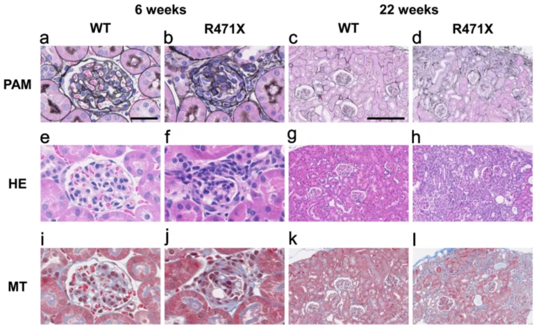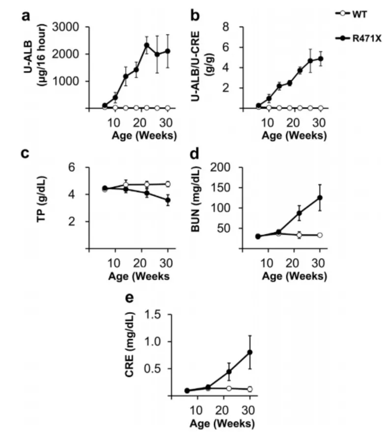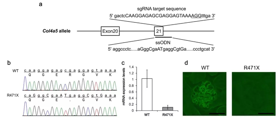 2019年,日本实验室构建了最新的Alport疾病模型,用同源重组的方法将含有人类相应突变(R471X)附近的序列通过sgRNA引导,Cas9切割,ssODN(含突变位点)进行修复等一系列的过程构建了无义突变的小鼠。造成该蛋白无法表达。对尿液的检测发现R471X小鼠的蛋白和肌酐水平显著高于正常组;血液中总蛋白没有显著差异,但是血液中的尿氮和尿肌酐出现明显的提升。对6周大的小鼠进行免疫组实验化也发现了R471X小鼠的肾小管纤维化。