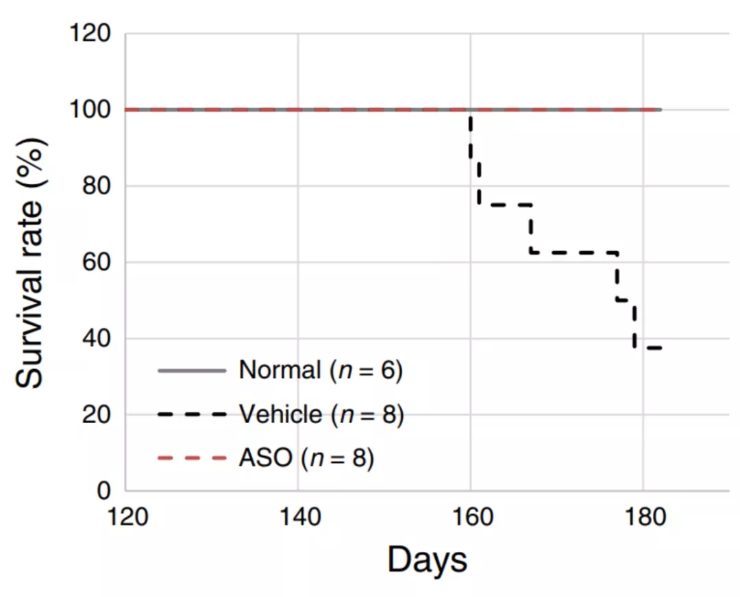 图6. 经过ASO治疗的小鼠的生存状态大大好于R471X小鼠,完全达到了野生型的水平。引自:Yamamura et al. 2020.