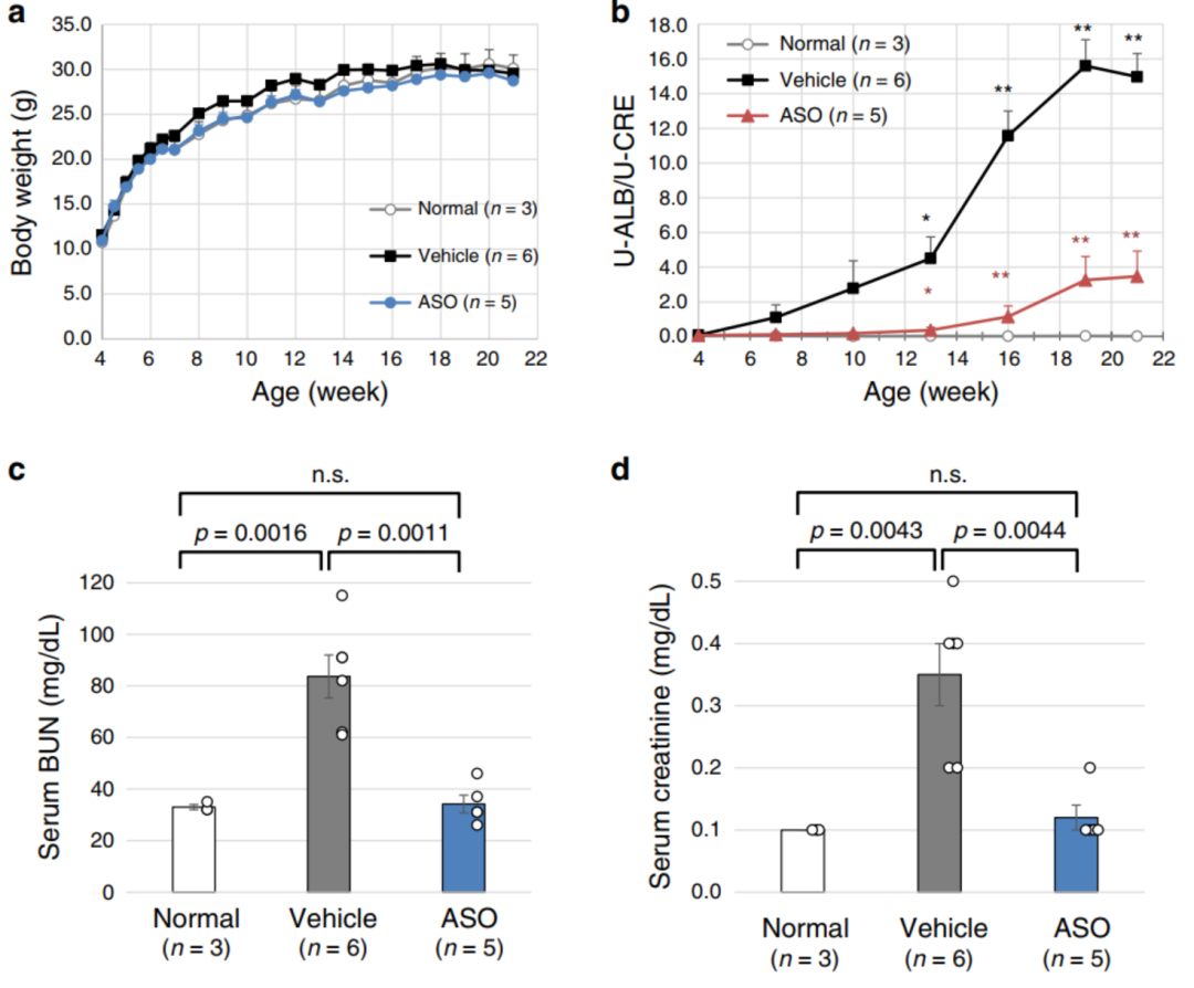 第二年,同一个实验室利用反义寡核苷酸(antisense-oligonucleotide, ASO)对上述模型(R471X)进行了治疗,原理是通过阻止21号外显子的翻译,让20号和22号外显子直接相连,跳过无义突变的区域。从小鼠4周龄开始,4-6周每周两次皮下注射,7-20周每周注射一次。结果显示经过ASO治疗的小鼠的生存状态大大好于R471X小鼠,完全达到了野生型的水平。在体重没有明显区别的情况下,其尿蛋白/尿肌酐水平大大降低,同时血液中的各项指标也几乎恢复到了野生型小鼠的水平。