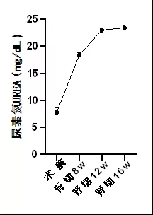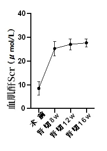 图1. 分别在5/6肾切除术8周、12周、16周后测BUN和Scr,手术后小鼠的BUN和Scr浓度显著升高。
