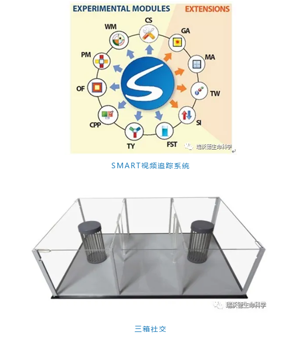 三箱社交,箱体两侧分别放测试动物熟悉过和首次接触的动物,检测小鼠靠近装有陌生小鼠金属笼的时间,以此判断小鼠的社交能力。