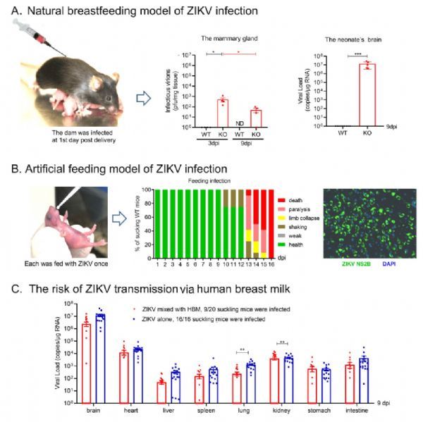 寨卡病毒(Zika virus, ZIKV)感染是全球重大公共卫生问题,寨卡疫情被世界卫生组织宣布为“国际关注的突发公共卫生事件”。2015年寨卡疫情在巴西爆发,发现大量婴儿出生时脑发育缺陷与该疫情相关。寨卡病毒主要通过蚊子叮咬传播,但它也可通过被感染的精液进行性传播。研究表明孕妇感染ZIKV后,病毒可以通过胎盘感染胎儿的大脑引发胎儿小头症。近期也有临床报道发现,在ZIKV感染的母亲乳汁中,可检测出ZIKV的病毒基因RNA片段和感染性病毒颗粒。ZIKV感染哺乳期母亲后,也有新生儿被ZIKV感染的病例报道,引发了人们对自然哺乳安全性的担忧。因此也提出了一个重要的科学问题:寨卡病毒能否通过哺乳感染婴儿?临床上还不能确定感染的婴儿ZIKV来自母乳,也没有基于动物模型研究证实乳汁在ZIKV传播中作用的报道。