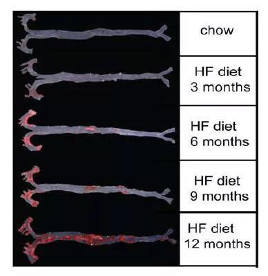 为了研究动脉粥样硬化病变随时间的发生发展,在0到12个月的不同时间段,解剖喂食高脂或正常日粮的 Ldlr敲除小鼠(Ldlr-/-)的全长主动脉并用苏丹 IV 染色。如图 2 所示, 0 个月时,高脂日粮饲喂的Ldlr-/-小鼠中仅观察到轻微受损(< 2% 的管腔面积)。3个月后,Ldlr-/-小鼠主动脉窦、主动脉弓或无名动脉中表现出轻微的损伤。前3个月动脉粥样硬化病变发展相对缓慢,随后几个月其病变发展进程逐渐加快,并在第 6 个月和第9个月扩展到胸主动脉和腹主动脉区域。在高脂日粮饲喂12个月后,Ldlr-/-小鼠的管腔面积被融合病灶占据[3]。
