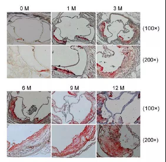 横断面分析能够提供有关病变厚度及其细胞组成的更多信息。饲喂高脂日粮的0至12个月期间,采集Ldlr-/-小鼠的主动脉窦的切片并用油红O染色以检测血管脂质。饲喂正常日粮的小鼠在瓣膜附着位点附近没有或没有显示出小的脂质负载细胞。随着高脂日粮饲喂时间的增加,病变进展为多层泡沫细胞沉积、纤维帽病变。
