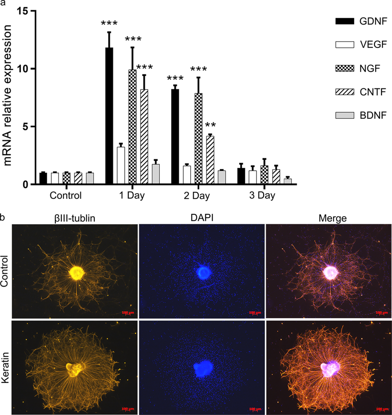 摘要:周围神经损伤后轴突再生和功能恢复仍然是一个临床挑战。损伤导致轴突解体,之后雪旺细胞(SCS)和巨噬细胞重新参与再生过程。目前,生物材料被认为是修复周围神经损伤最有希望的方法。角蛋白作为一种天然材料,来源广泛,具有良好的生物相容性和生物降解性。用还原法从人发中提取角蛋白,经进一步加工得到具有多孔结构的角蛋白海绵。结果表明,角蛋白在体外可促进细胞粘附、增殖、迁移以及SCS分泌神经营养因子,调节巨噬细胞炎性细胞因子的表达。我们首次报道人发角蛋白能促进DRG神经元轴突的延伸。角蛋白海绵敷料减轻了坐骨神经挤压损伤引起的运动障碍。因此,角蛋白被认为是一种有价值的生物材料,可以促进周围神经再生。简介:周围神经损伤逐年增多,给病人和社会带来了沉重的经济负担。损伤后修复是一个复杂而漫长的过程,在此过程中去神经雪旺细胞(SCS)去分化为一个更活跃的表型。迁移到损伤部位形成Bungner 带,然后分泌神经营养因子来滋养轴突,使轴突沿着Bungner 带延伸。巨噬细胞通过清除髓鞘碎片和表达调节局部炎症反应的各种炎症因子参与损伤后修复。迄今为止,周围神经损伤尚无有效的治疗方法,生物材料被认为是一种有前途的选择。近年来,医学再生胶原膜、聚乙醇酸和聚乳酸共聚物等多种神经修复材料得到了发展。然而,这些生物材料在人体中的应用仍然存在着各种各样的问题,包括免疫排斥、降解速度的不确定性、降解产物的毒性、材料来源有限和成本高。人发角蛋白具有良好的生物相容性、非免疫反应性、细胞间相互作用和生物降解性,被认为是促进周围神经损伤修复的优良生物材料。角蛋白的粘附序列ldv和rgd也存在于几种能够支持细胞粘附的细胞外基质蛋白中。以往的研究表明,12种细胞,如神经和骨髓干细胞,在角蛋白纳米粒制备的细胞培养膜中有明显的增殖和生长。角蛋白在一定条件下也能形成均匀的孔大小角蛋白海绵,在60℃高温下能保持数小时的形状。这一特性将角蛋白与相对低变性温度的胶原区分开来。我们假设,角蛋白在体外可以激活修复相关细胞,而制备的角蛋白海绵作为敷料可以加速坐骨神经损伤的修复。人发角蛋白提取及角蛋白海绵的制备:用先前报道的方法提取人发角蛋白,并进行修改。简单地说,采用还原法提取人发角蛋白。首先,将氯仿和甲醇(2:1v/v)的混合物添加到清洁的头发中15–20min以脱脂。然后将脱毛后的毛发(10g)加入SDS(6g)、尿素(90g)和β-巯基乙醇(15ml)在300ml双蒸馏水中溶解制备的混合溶液中,在60℃下在pH7条件下反应3天。将所得混合物离心并通过滤纸过滤。然后用双蒸馏水彻底透析滤液,每6 h更换一次,直至完全去除尿素等。0.22μm过滤器过滤的角蛋白可在室温下稳定储存一年。在24孔板的每个孔中加入总共1 ml角蛋白(40 mg/ml),在-20度下冷冻3天,然后冻干,形成稳定且不溶于水的角蛋白海绵。电子显微镜分析:扫描电子显微镜前,将角蛋白海绵切成1-2 mm的薄片,涂上金。首先将神经样本固定在2.5%戊二醛溶液中,在磷酸盐缓冲盐水(PBS;pH7.3)中冲洗。用1%四氧化锇固定并在一系列分级乙醇中脱水。将样品嵌入环氧丙烷中,在60℃下培养48小时。用透射电镜观察了用柠檬酸铅制备和染色的超薄切片。用IMAGEJ软件测量轴突平均髓鞘直径和髓鞘厚度。角蛋白涂层:将无菌角蛋白(0.3 mg/ml)添加到培养板中,覆盖底部,然后放入37℃培养箱中进行涂层。24 h后,抽吸溶液,在井底表面留下一层薄薄的流体膜。细胞培养:RSC96(大鼠雪旺细胞株)和RAW264.7细胞系在37摄氏度的添加10%FBS的DMEM中培养,并在含有5%二氧化碳的培养箱中培养,培养基每2天更换一次。原代细胞培养:从出生后1-3天的SD大鼠坐骨神经中分离出原发性SCS。细胞在涂有聚赖氨酸的培养板上培养24h,然后用阿糖胞苷(10μM)进一步纯化48h。本实验使用p3-p8初级SCS。简单地说,从三天大的SD大鼠身上获得背根神经节(DRG)。将分离的神经节在3 mg/ml胶原酶A中培养30 min,37 ℃,中和离心后加入0.25%胰蛋白酶30 min。最后,将单个DRG分为两组进行24小时培养。细胞粘附试验:在75 mm低粘聚乙烯板的右侧涂上角蛋白。然后加入5×107 RSC96细胞,置于37℃培养箱中,24h后观察细胞在两侧的粘附情况。为了进一步测试粘附率,将6×105 RSC96细胞添加到涂层和未涂层的标准聚苯乙烯24孔板中。在接种后6 h内,两组每小时计算未附着细胞数。细胞增殖测定:将细胞接种在有涂层和无涂层的96孔板(3000个细胞/孔)上,补充1%FBS。用细胞计数试剂盒-8评估第1、3、5和7天的细胞增殖。在450 nm处测量吸光度。5×106 RSC96细胞接种在有涂层和无涂层的6孔板上,辅以10%FBS,持续1天、3天、5天和7天。然后根据制造商的说明,用苏木精和伊红(HE)试剂盒对细胞进行染色。用直立显微镜收集图像。细胞迁移分析:将具有10%FBS的DMEM(600uL)添加到涂层和未涂层的孔下层。将5×104的原代SCs血清游离细胞悬液(200μL)加入孔上层,培养12 h。用4%多聚甲醛去除固定30分钟,用PBS洗涤三次后用结晶紫染色。在直立显微镜下对染色细胞进行成像和计数。在伤口愈合试验中,将5_×104初级SCS接种在有涂层和无涂层的24孔板上。将细胞生长至单层,血清饥饿12小时,然后用无菌10 uL吸管尖形成线性划痕,将24孔板的培养基立即更换为无血清培养基。伤后0、12小时用倒置显微镜对划痕部位进行拍照。免疫荧光染色:用4%多聚甲醛固定DRG神