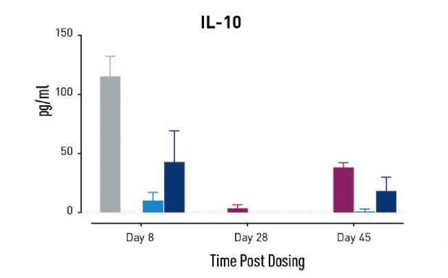 图 2.GvHD进展过程中细胞因子的检测。用Abatacept或低剂量/高剂量双特异性抗体处理植入人PBMC的NSG小鼠模拟GvHD。在研究第28和45天,用高浓度双特异性抗体处理的小鼠比用Abatacept治疗的小鼠释放更少的细胞因子。