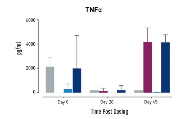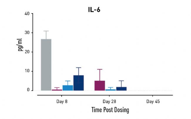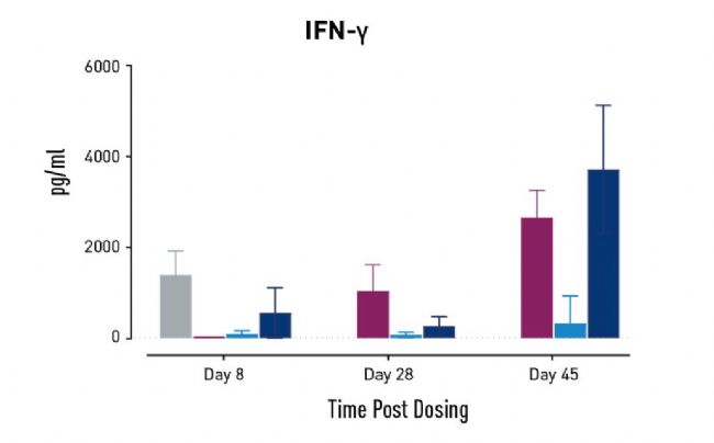 借助我们的人源化小鼠模型,我们不仅能够测量给药后释放到血液中的各种人细胞因子的水平,还能观测到这些细胞因子随时间推移对全身的下游效应。