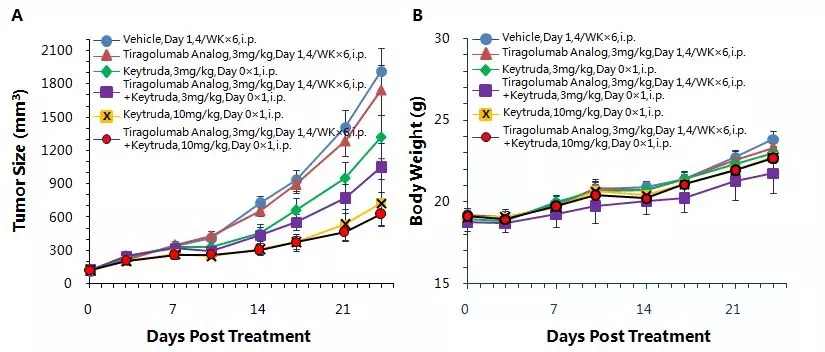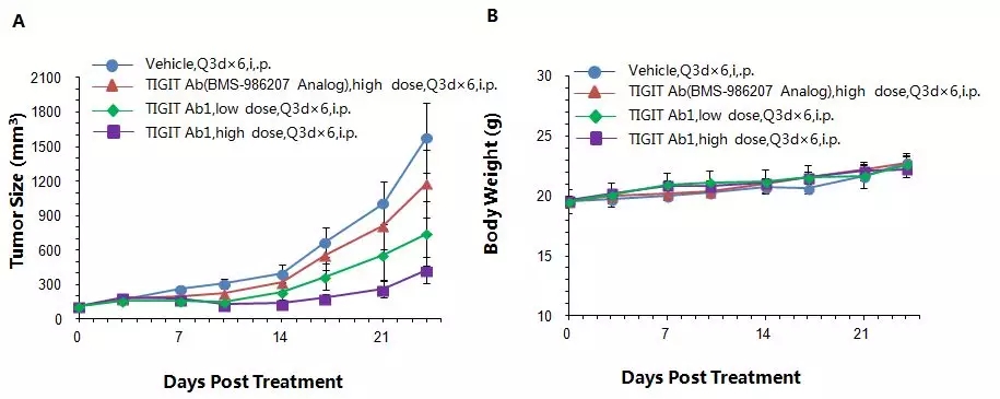 将小鼠结肠癌MC38细胞皮下植入纯合B-hTIGIT小鼠中。当肿瘤体积为约150±50mm3时,将小鼠分成对照组和治疗组(n = 7)。实验数据结果表明抗人TIGIT抗体抑制纯合B-hTIGIT小鼠中的肿瘤生长,说明B-hTIGIT小鼠模型是体内hTIGIT抗体功效研究的有效工具。(A)肿瘤平均体积±SEM,(B)小鼠平均体重±SEM。