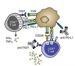 据相关研究表明,在癌症模型中,大量的细胞毒T细胞和辅助T细胞表达PD-1或CTLA-4,意味着这些T细胞处于耗竭状态,但研究发现只有一小部分NK细胞表面有PD-1或CTLA-4。肿瘤内的大部分NK细胞表达TIGIT,它们产细胞因子能力显著下降,出现凋亡。这说明采用PD-1抗体或CTLA-4抗体治疗癌症,有可能不能恢复大多数NK细胞的战斗力。后来的动物模型研究发现,即使是没有T细胞,TIGIT抗体仍旧可以逆转NK细胞的耗竭,延缓肿瘤的生长速度,缩小肿瘤的体积。由于NK细胞识别癌细胞是不依赖于肿瘤抗原的,所以恢复NK细胞的战斗力很关键,而且有助于重新活化细胞毒T细胞[3]。