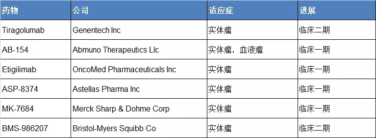 目前尚无TIGIT靶点相关上市药物,其相关药物在肿瘤治疗领域中的研究情况如下图所示: