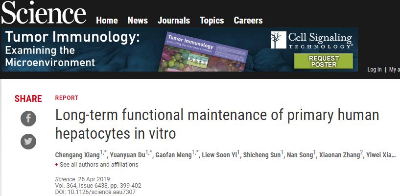 近日,北京大学邓宏魁研究组、解放军总医院卢实春研究组以及复旦大学袁正宏研究组联合发表在《Science》杂志上的一篇论文,为肝病治疗带来了希望的曙光。研究显示,科学家们首次证明了一种化学小分子可以调控细胞信号通路,帮助实现功能性肝细胞在体外的长期维持。此外该研究还证明了肝细胞在体外支持乙型肝炎病毒(HBV)及丙型肝炎病毒(HCV)的长期持续感染。这项研究为大量制备功能成熟细胞及其应用提供了可能。