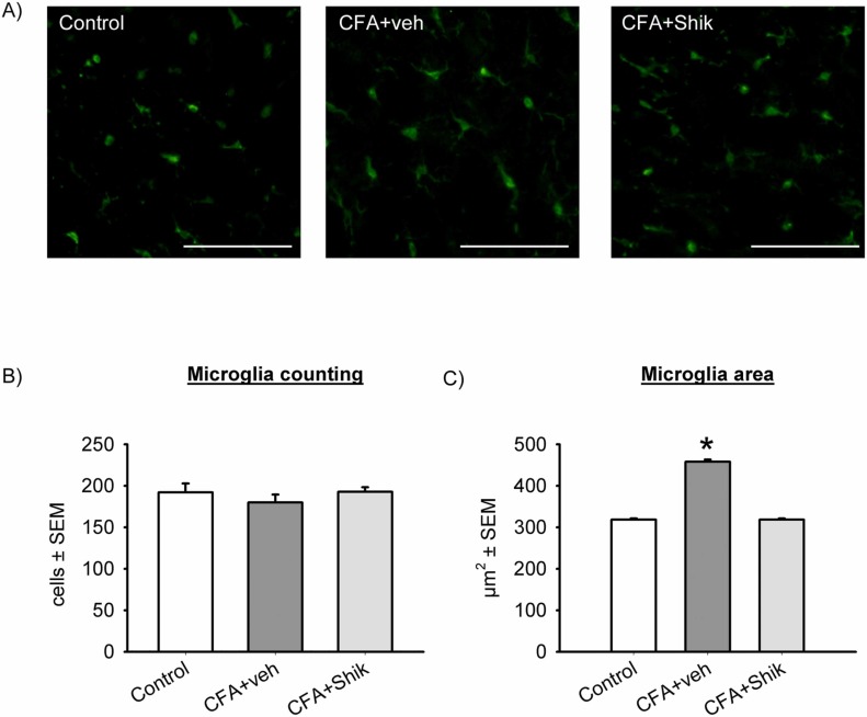 CFA 诱导外周炎症后脊髓小胶质细胞活化:在脊髓背角进行小胶质细胞的形态计量分析。图2A显示了使用小胶质细胞特异性标记物Iba-1的代表性免疫组织化学染色。小胶质细胞的定量分析显示,与对照组或预防性紫草素治疗(CFA+Shik 组)相比,CFA 足底内诱导炎症(CFA+veh 组)后小胶质细胞数量没有显著增加。观察到 CFA+veh 组细胞形态产生了显著变化。与对照组相比,CFA 足底内诱导炎症(CFA+veh 组) 1 小时后小胶质细胞面积增加了约 39%。紫草素的预防性治疗(CFA+Shik组)对小胶质细胞面积有显著的抑制作用,与对照水平相当,两者之间无显著差异。