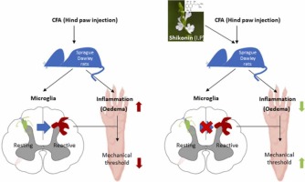 我们已经展示了紫草素作为镇痛药物的潜在作用,它可以抑制炎症性疼痛动物模型中的小胶质细胞形态变化。预防性紫草素给药可减少单侧足底内注射 CFA 引起的机械性痛觉过敏。与没有紫草素预治疗的动物相比,用紫草素预治疗的动物显示注射 CFA 的爪中水肿形成更小和机械阈值更高。 还观察到 CFA 治疗诱导脊髓小胶质细胞活化而紫草素预防性治疗强烈逆转了这种活化。