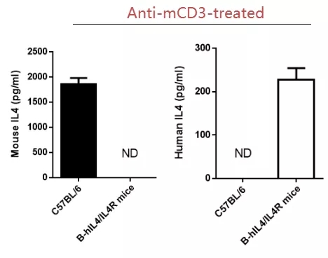 结果显示:在C57BL/6小鼠血清中可检测到mIL4蛋白表达,B-hIL4/hIL4RA小鼠血清中可检测到hIL4蛋白表达。