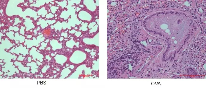 B-hIL4/hIL4RA小鼠建立哮喘模型后进行肺组织H&E染色。结果显示相对于PBS对照组,哮喘阳性组表现出明显的斑片状支气管周围炎性浸润,主要由嗜酸性粒细胞和淋巴细胞组成。