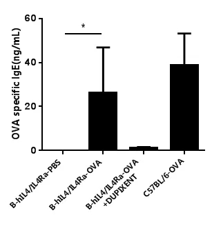实验终点收集小鼠血清样本,检测分析IgE水平。再利用Dupixent Analog处理后,与阳性对照相比给药组IgE水平明显降低。