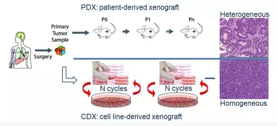 细胞系模型以体外培养的传代肿瘤细胞在免疫缺陷鼠体内接种而建立,由于细胞体外长期传代而呈现有高同源性特点,模型建立容易,重复性好,在肿瘤药物研发中仍有极大需求, 但在体外不断培养传代过程中,肿瘤异质性与原始肿瘤组织存在较大的差异,从而在预测临床药效方面不甚理想。