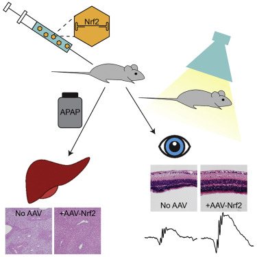 摘要:Nrf2是驱动多器官系统中抗氧化基因表达的转录因子。我们假设Nrf2过表达可以治疗应用于氧化还原稳态被破坏的疾病。在本研究中,腺相关病毒(AAV)-Nrf2在小鼠急性对乙酰氨基酚诱导的肝毒性模型中进行了试验,并成功地给予了肝毒性的保护,验证了载体设计和NRF2介导的早期保护作用。此外,AAV-Nrf2在光诱导小鼠年龄相关性黄斑变性模型的治疗潜力也被测试。成年BALB/c小鼠用AAV-NFR2玻璃体内注射,并在注射后受到轻度损伤。分别用光学相干断层摄影和电子视网膜摄影监测光损伤后的视网膜厚度和功能。损伤后3个月,注射眼与未注射的对照组相比视网膜厚度更大。在损伤后1个月,AAV-NFR2注射促进了光损伤的完全功能恢复。结果显示Nrf2过度表达在多器官中的治疗潜力。关键词:基因治疗 Nrf2 AAV 氧化应激 抗氧化剂 视网膜病变 视网膜 肝脏 对乙酰氨基酚 光损伤简介:Nrf2是一种转录因子,在急性和慢性环境应激反应中起着无处不在的作用。内源性抗氧化基因表达受抗氧化反应元件(ARE)启动子区的调控,Nrf2结合ARE,作为主调节器驱动下游抗氧化剂基因表达。NRF2在氧化还原稳态条件下持续降解,仅在氧化应激条件下才具有转录活性。Nrf2在疾病病理生理学中的作用已经在多器官系统中得到了探索,包括肝脏、肺、心脏和大脑,NRF2-ARE通路的激活已被证明在各种氧化应激系统中具有保护作用。大多数老化和退行性疾病至少部分是由于暴露于氧化应激。例如,活性氧(ROS)和活性氮(RNS)在许多慢性眼病的发病机制中起着重要作用,特别是老年性黄斑变性(AMD),在美国,AMD是导致失明的主要原因。值得注意的是,与目前使用的许多其他免疫学或遗传动物模型相比,光诱导的视网膜变性更接近于AMD的许多特征。氧化应激是视网膜变性的治疗靶点.长期以来,抗氧化维生素和补充剂一直被证明在AMD中提供治疗益处,鉴于许多视网膜疾病的遗传异质性和多因素病因学,我们假设NRF2的过表达可能是一种普遍适用的治疗策略,以治疗各种疾病的氧化应激。结果:AAV-NFR2载体体外高效驱动ARE和减少活性氧:将人Nrf2克隆到含有普遍存在的CBH启动子的AAV表达质粒中。免疫印迹证实HEK29 3T细胞转导Nrf2过表达和ARE驱动基因表达。伴随Nrf2过表达,ARE驱动基因γ-谷氨酰半胱氨酸合成酶(γ- GCSm)上调。血红素氧合酶-1(HO-1)在Nrf2过表达后同样上调,作为转染控制,α1-抗反转录酶是并行转染的。进一步评价AAV-NFR2在氧化应激后抑制活性氧水平的能力。HEK293T细胞经AAV-Nrf2转染或未转染,经过氧化氢和三氧化二砷诱导氧化应激。AAV介导的Nrf2过表达导致H2O2-和三氧化二砷诱导的ROS水平相对于对照组降低,用细胞内氧化应激荧光指示剂CM-H2DCFDA进行测定。在无病毒与AAV荧光素酶对照之间没有观察到荧光差异。AAV-NFR2保护小鼠免受对乙酰氨基酚肝毒性的影响:Nrf2在保护肝脏免受急性对乙酰氨基酚引起的损伤中的作用已被描述过。通过尾静脉注射普遍存在的CBA启动子,发现AAV8血清型在肝脏中高效表达。在CBA启动子控制下,Nrf2被克隆到AAV2反向末端重复序列(ITR)主链中,并被包装到AAV8衣壳中。nrf2-/-小鼠在对乙酰氨基酚(APAP)给药前1个月尾静脉注射AAV8-CBA- Nrf2。口服给药600 mg/kg对乙酰氨基酚可使Nrf2-/-小鼠在48小时内死亡86%,而对野生型对照组无明显影响。AAV-Nrf2预处理对Nrf2-/-小鼠有保护作用。APAP给药后24小时肝组织H&E染色石蜡切片显示Nrf2-/-小鼠小叶中心广泛苍白坏死区。在给予APAP之前接受AAV-Nrf2的Nrf2-/-小鼠不存在。除了Nrf2-/-小鼠的基因替代,我们还观察了野生型小鼠中nrf2的过度表达。同样,AAV-NFR2也介导了APAP诱导的肝毒性对野生型小鼠的保护作用。给药1000 mg/kg APAP可导致野生型小鼠80%的死亡率,而在APAP给药前接受AAV-NFR2的野生型小鼠受到保护。APAP后24小时肝组织H&E染色石蜡切片显示野生型小鼠小叶中心坏死,而给予APAP前接受AAV-Nrf2的小鼠则无此现象。玻璃体内注射AAV2视网膜转导:为了探讨Nrf2在慢性疾病中的治疗潜力,将AAV-Nrf2应用于光诱导AMD模型。将GFP和nrf2克隆到TR CBH-AAV表达质粒中,并分别包装成AAV2.5衣壳。AAV2.5先前在R.J.S.实验室中设计成将AAV1的改良转导特性与针对两种亲本血清型的抗体的抗原反应性降低结合起来,同时保持AAV2的受体结合特性。玻璃体内注射AAV-NFR2,注射后8个月Western blot检测表达情况。虽然在视网膜裂解液中未检测到NRF2蛋白,与Nrf2-/-和野生型小鼠未注射眼内的对照裂解物相比,ARE控制的典型NRF2读出物HO-1被强烈上调。为了评价载体的趋向性,将AAV2-CBh-GFP和AAV2.5-CBh-GFP分别以1×108个载体基因组注入小鼠眼内,每只眼注射1μL。注射后4周的荧光眼底镜显示AAV2.5介导的可见荧光比AAV2更大,特别是在视网膜血管中。免疫组化的视网膜横截面显示AAV2.5在Müller胶质细胞中的转导与AAV2相比增加..AAV-NFR2保护视网膜结构免受严重光损伤:为了检测AAV-NFR2在视网膜变性中的治疗潜力,采用光诱导视网膜病变模型。成年BALB/c小鼠一次性注射AAV-NFR2,另一只眼睛不注射。注射六周后,小鼠暴露于4000lux白光下3小时,导致严重视网膜变性。使用体内光学相干断层扫描(OCT)视网膜成像监测视网膜形态学从1周开始,并随访至3个月。OCT扫描在四个主要方向相对于每个眼睛的视神经。为了将OCT上看到的定性病理结果转换成可量化数据用于比较,OCT图像被蒙蔽,并对病理特征进行评分。光损伤后1周和3个月的OCT扫描对病理特征进