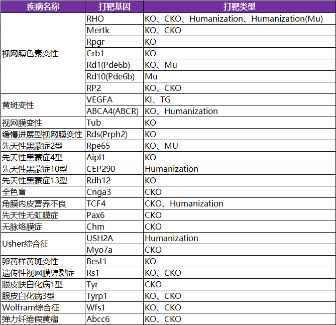 RP的遗传方式比较复杂,多种基因突变均可导致发病,在遗传视网膜疾病中,目前发现引发RP的基因大约有70个,且同一种致病基因在不同位点发生突变,其RP类型也不相同。因此,研究人员尝试通过递送基因药物修复发生突变的基因,有针对性地达到治疗疾病的效果。在药物开发过程中,需要针对疾病和突变基因创建有效的大小鼠模型,用于药理药效的评估。下面介绍常见的几种该疾病在基因治疗中常见的靶点和有效的大小鼠模型。