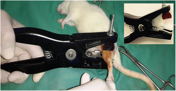 摘要:闭合骨折模型的使用已成为研究骨折愈合过程的首选模型,骨折部位周围的骨膜和软组织在骨折愈合过程中起着重要作用。一些技术,如截骨,钻长骨和使用断头样装置诱导骨折,其特点是不良反应和并发症。本研究的目的是优化和评价使用三点弯曲钳的体内骨折模型,可用于大鼠继发性骨折愈合的研究方法:改良三点弯曲钳作为闭合性大鼠胫骨骨折的制作方法,使用髓内钉在大鼠前部固定。闭合性骨折的确切位置是沿长骨。在骨折发生后立即检查骨粉碎的存在和骨折骨的排列,直到第六周。结果:所有骨折均为横断,,位于胫骨中段至胫骨近端三分之一处,均愈合,无并发症。术后2~3周X线显示为骨性愈合。骨折线与胫骨轴的平均夹角为89.41±2.11°。侧位和前后角的角度分别为167.33±3.67°和161.60±4.87°。与完整骨的完整长度相比,骨折骨近端的平均长度为41.02±3.27%。总骨痂面积和总骨痂指数有显著性差异,而X线骨痂指数无显著性差异。轻度粉碎(n==4)与非粉碎(n==21)之间的毛痂面积差异不显著。结论:优化的大鼠胫骨骨折模型主要是胫骨横突中段骨折,骨粉碎最少,无周围软组织损伤。随之而来的软组织痂形成的面积大小和闭合骨折模型的重现性很好,使得其在体内实验室研究中是可行的。关键词:骨折模型 大鼠 胫骨 体内背景:在杰克逊等人先前设计模型的基础上,Bonnarens等人描述了大鼠骨折模型。在这个模型中,在骨折前使用髓内针(IM)通过膝关节逆行植入。然后,一个固定的重量落在一个钝断头台上的骨头上,形成了一个标准化的闭合性股骨中段骨折。一些研究已经报道了使用钝断头术的股骨骨折大鼠模型中的复发并发症,包括死亡、错位骨折、过度粉碎和深部感染。此外,骨折愈合过程中骨折的不同程度的愈合尤为困难。骨折粉碎程度对愈伤组织的形成有影响,大鼠骨折模型与粉碎后的骨痂形成有一定的相关性。在大鼠胫骨骨折模型中建立骨折,结果显示粉碎性小,但骨块移位高,针尖角度大于10°。在大鼠胫骨骨折模型中使用三点钳表现出最小的水肿和死亡,但在骨折六个月后仍有明显的胫骨痂缩短率,且针角为80±2°。由于现有骨折模型的局限性,需要一种可靠的骨折模型,尤其是实验动物,这是可行的和可重复的。方法:动物:使用10只,30周龄的及71只,8周龄大鼠。骨折采用三点弯曲钳,如下所述。在体内研究中,共使用二十五只(n=25),8周龄的雌性Sprague-Dawley大鼠,平均体重187.04±10.15克。在体内研究中,共使用二十五只(n=25),8周龄的雌性SD大鼠,平均体重187.04±10.15克。在实验开始前有一周的驯化期。在驯化期后,大鼠在手术前空腹12小时。手术操作:所有的手术都是用氯胺酮和甲苯噻嗪的预麻醉下进行的。各组大鼠肌肉注射氯胺酮(40 mg/kg)和甲苯噻嗪(5 mg/kg)后进行手术和放射显影。手术切口采用4 mm皮肤切口,用解剖刀刀片(#15)在膝关节处进行手术切除。用不锈钢暴露胫骨,并通过胫骨、颅骨至前交叉韧带的附着和半月板前角之间手动引入尖锐探头,以确定髓内针入口的面积。23G,11/2"针插入到胫骨远端, 针的穿透深度约为22毫米。髓内钉完全穿过胫骨后,用骨切割器将多余的近端针头切断。切口用简单间断不吸收4/0尼龙缝线闭合。为了改变大鼠胫骨的骨折,通过修改奥托等人的上颌压缩钳口,构造了特别改进的三点弯曲钳,尺寸为10×0.1 mm。将三点弯曲钳的两个支撑爪改为7毫米,而不是17毫米。使用钳子后,目视控制位置,钳子闭合,直到听到裂纹声,钳子的阻力突然下降。此后立即释放了压力。应用上述原理建立大鼠胫骨或股骨骨折模型。左侧胫骨骨折,对照侧右侧胫骨完整作为对照。每只动物被放置在单独的笼子中,以允许手术后自由活动。术后每天给药曲马多5 mg/kg作为镇痛连续给药3天。腹腔注射20 mg/kg的戊巴比妥对动物进行安乐死,进行放射学观察。骨折的大体评估:由于骨折是髓内钉预先固定在骨折骨中,骨折被认为是稳定的,并且不需要额外的术后外部支持绷带。从诱导骨折和非骨折肢体(对照)中收集解剖胫骨。分别于术后第一、第二、第三、第四、第六周各处死五只大鼠(n=5)。用解剖胫骨和对照方法测定毛痂指数和愈伤组织面积大小。用一台3.1μm像素的解剖立体显微镜拍摄解剖骨图像,测量大鼠胫骨骨折愈合的骨痂宽度(mm)。以对侧大鼠右侧胫骨为对照,用IMAGE软件对愈伤组织指数的比值进行测定。用同样的软件测量骨痂面积、骨痂指数、针角、近端骨折、全长骨折和正常对照骨。骨折的放射学评价:术后即刻及术后每周一次,使用X射线机对骨折和对侧完整的胫骨进行两个角度的X线摄影。用骨关节、骨痂形成的大小、骨粉碎程度、针角、X线骨痂指数等指标对骨愈合情况进行客观评价。X线骨痂指数为胫骨中段骨痂形成的最大宽度,包括原骨除以对侧控制骨的宽度。粉碎性骨折是将骨分裂或断裂成两个以上的碎片。第一,两个前后位的影像学观察未见粉碎现象。第二,较小的碎片粉碎,其大小小于钉直径,即<1.1 mm;第三,严重粉碎(大于1枚髓内钉直径的大碎片)。骨折的组织学检查:术后第1, 2, 3周、第4周、第6周处死动物,每周从断肢处收集解剖胫骨标本(n=5)。在骨折部位(骨痂形成明显)下,将骨切成2 mm,在甲醛10%中固定24小时,在10%甲酸中脱钙4天,然后再处理,用H&E标准染色。结果:对30周龄大鼠进行初步研究(n=10),结果显示胫骨骨折主要以粉碎性、倾斜性和远中
