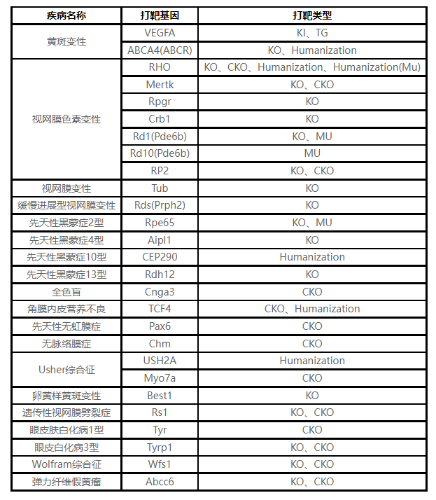 除了以上提及的VEGFA小鼠模型,针对视网膜色素变性、先天性黑蒙、全色盲等疾病,赛业生物也开发了一系列基因编辑和人源化小鼠模型,同时可为研究人员提供个性化定制服务。