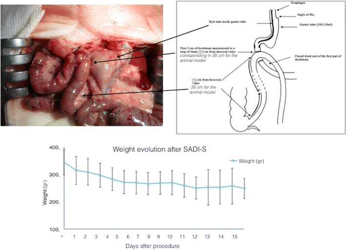 摘要:袖状胃切除术联合单一十二指肠吻合术(SADI- S)是一种简化的胆胰管分流术。本研究的目的是开发一种可重复使用的SAID-S动物模型。我们采用了三种十二指肠分离和十二指肠吻合术:(a)手术夹和侧到侧吻合,(b)结扎和侧到侧吻合,(c)剖开十二指肠,关闭十二指肠残端和端侧吻合。记录手术方法和每种方法的并发症。31只大鼠中有二十五只存活至研究结束。其中1例死于意外麻醉过量,另1例死于吻合口漏。四例十二指肠切除术后再通。我们的SADI-S小鼠模型可以始终如一地再现。剖开十二指肠是最好的,以避免十二指肠再通。关键词:动物模型 代谢外科 SAID-S 十二指肠 胆胰管分流术简介:Sndi-Pnnute A.等人提出了一种应用袖状胃切除的十二指肠吻合术(SADI S)。SAID-S的优点包括单一的吻合术、无肠系膜开孔、幽门保存以及从胃到回肠的营养递送的"短路"的生理优势。直到我们的研究,没有动物模型来调查这个过程,我们提出了一个可重复的动物模型SADIs。方法:本研究纳入三十一只成年雄性Wistar大鼠(12~16周龄)。在恒定环境温度(23°C)和湿度下,将所有动物置于单独的笼子中,并保持12小时的光/暗循环。手术前准备:手术前一晚,大鼠被放置在高架钢丝平台上,以避免食粪和禁食约12小时;仅允许水自由采食。异氟烷麻醉箱用于诱导麻醉,在麻醉过程中改为插管以维持麻醉。恩诺沙星2.5%,25毫克/公斤,肌肉注射抗菌, 20毫升生理盐水皮下注射(术前10 ml,术后10 ml)。外科手术:诱导后,用电动理发器从胸骨到腹股沟剃毛,将大鼠置于背卧位的加热垫上。使用碘伏水溶液对皮肤进行消毒,在识别剑突后,使用11外科手术刀制作5cm中线腹部切口。在鉴定出白线状后,用电刀在腹壁做中线切口。然后用手术器械暴露腹腔。使用手术剪完成了较大曲度的胃切除术。4个可吸收缝线结扎后,将胃脾韧带切分,继续十二指肠切开。接着,使用一个8FR导管从口到十二指肠或从十二指肠外侧切开。使用蓝色可重新装载的腹腔镜吻合器在8FR导管周围进行标准袖状胃切除术。将小肠的长度从回肠结肠交界处测量,约为肠道总长度的30%;约35厘米。这一点是未来十二指肠吻合的位置。三种方法用于十二指肠分离和十二指肠吻合:1、从幽门距十二指肠5mm处使用3.0不可吸收风险进行结扎,采用可吸收6.0缝线连续进行侧至侧十二指肠吻合。2、从幽门距十二指肠5mm处使用不可吸收的手术夹进行结扎,采用可吸收6.0缝线连续进行侧至侧十二指肠吻合。3、从幽门距十二指肠5mm处做切口,用非吸收性6.0缝线连续缝合十二指肠残端以可吸收的6.0缝合线连续进行端至侧的十二指肠吻合。吻合后,我们用连续的3条不可吸收缝线将肠管送回腹腔并闭合腹部肌肉。用不可吸收的4.0缝线间断式闭合腹部皮肤。术后护理:立即手术后,每个大鼠在热灯下恢复,持续监测直到恢复知觉。恢复后,动物被隔离转移到笼子,放在一个上升的电线平台上,头24小时禁食。接下来的3天为其提供液体饮食。抗生素(恩诺沙星)给药72 h。在第7天给予全固体饮食,过渡期为3天,在此期间,我们同时提供液体和固体饮食。在研究结束时,在异氟醚麻醉下剖腹探查术后,断头处死大鼠。取脑进行免疫组化研究,测量神经元活性。记录手术时间和麻醉死亡,研究期间,我们的目标是用大鼠验证技术,持续2周。在手术前和术后每一天记录体重,调查每一次死亡以确定并发症。2周后,进行剖腹探查以确定十二指肠排便的瘘管、肠阻塞或再通透性。结果:平均手术时间40±15 min,三种手术方法无显著性差异。大鼠平均初始体重为344±34g((范围263~475 g),术后平均体重261±42 g(195~391 g)。六例死亡,其中一例继发于麻醉过量。其他五例死亡由术后第一天和术后第七天吻合口漏引起;侧侧吻合组发生吻合口瘘三例。在2周的剖腹探查术中,我们发现了两个吻合口脓肿(1侧到侧组和1侧到端侧吻合组),4例十二指肠排便再通(三例为不可吸收缝线,1例为手术夹)..结论:据我们所知,我们是第一个评估SADI-S.动物模型可行性的研究。我们选择了Wistar大鼠,因为它是最主要用于肥胖症和糖尿病的临床前研究中使用的品种。