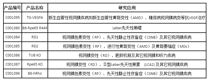 针对先天性黑蒙症、进行性黄斑变性、视网膜色素变性、视网膜变性等眼科疾病,赛业生物开发了一系列基因编辑和人源化小鼠模型;针对研究人员的需求,也可定制或合作开发基因编辑小鼠模型,如基因敲除、基因敲入、点突变、人源化小鼠模型及大小鼠手术疾病模型,加速药效学验证实验的开展。