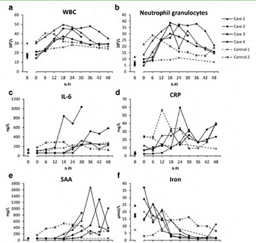 摘要:猪血源性金黄色葡萄球菌败血症模型曾在本课题组建立。在这些研究中,猪在48小时的研究期间出现严重的脓毒症,包括肝功能紊乱。由于猪在研究过程中清醒,动物福利受到诱发疾病严重程度的挑战,这在某些情况下需要人道安乐死。因此,进行了一项试验研究,以确定足够的接种浓度。操作方法需要在我们预先定义的人道终点的范围内产生肝机能障碍的迹象。方法:四只猪接受1×108单位/公斤体重的金黄色葡萄球菌,两只对照组接种生理盐水。固定输液速率为3毫升/分钟,而接种量,即剂量体积,随猪体重而改变。使用了以下剂量量:10毫升(n = 1),20毫升(n = 2),和30毫升(n = 1),对应于3.33、6.66和10分钟的输液时间,分别3×107剂量率,1.5×107,和1×107 CFU /分钟/公斤体重。分别于接种前和注射后6小时抽取全血进行计数、临床化学和炎症标志物检查。在安乐死之前,用半乳糖清除能力试验评估肝功能。接种48 h后猪被实施安乐死,进行尸检和组织病理学评价。结果:输液时间为6.66分钟以上,没有诱导肝功能障碍(n = 3),输液时间为3.33分钟(n = 1)引起的参数变化类似于我们以前的研究中所看到的,增加胆红素和天冬氨酸转氨酶,以及肝内纤维蛋白裂解产物的组织病理学发生。30 h后根据人道的终点猪被实施安乐死。结论:在科学目的和动物福利之间不能达到一个可用的平衡,因此我们很难证明进一步使用这种有意识的猪败血症模型是正当的。为了建立一个关于人类败血症的翻译相关性模型,我们建议未来的模型应该使用长期麻醉。关键词:脓毒症 猪 动物模型 半乳糖消除能力(GEC) 肝功能障碍 人道终点 动物福利背景:肝脏作为脓毒症的一个多功能器官,在脓毒症中起着核心作用。人类的重症监护病房(ICU)内,胆汁淤积性肝功能障碍是一种常见的发病率,出现如感染、败血症、大手术、输血,使用抗生素和其他药物的肝毒性的副作用。诊断通常基于血清胆红素浓度的增加,通过转氨酶谷草转氨酶(AST)、丙氨酸氨基转移酶(ALT)、碱性磷酸酶(AP),乳酸脱氢酶增加和/或低蛋白血症发生来支持。持续性高胆红素血症与金葡菌败血症患者死亡率增加有关。脓毒症相关肝功能障碍的发病机制尚不清楚。之前我们已经进行了两相关脓毒症模型,实验猪接种血源性金黄色葡萄球菌,研究时间长达48小时。从接种到安乐死的观察期间,猪是处于清醒状态的。脓毒症的临床症状包括体温升高,中性粒细胞, C-反应蛋白(CRP)和白细胞介素-6(IL-6)增加,血清铁降低。增加血液的高凝状态,血小板数量的减少表明凝血系统功能障碍,而特别值得注意的是肝功能异常是间接表明高胆红素血症与肌酸激酶水平正常AST一起增加(CK),以及纤维蛋白从肝内小血管渗出。从肝组织中分离到少量的细菌,,表明肝脏的影响是全身炎症反应的一部分,而不是肝脏局部感染的结果。这些观察结果导致了实验性金黄色葡萄球菌败血症猪出现肝功能障碍的假设。接种血源性金黄色葡萄球菌48小时后,通过引入半乳糖消除能力测试(GEC),确认和量化肝功能不全的存在。动物福利与模型稳健性师研究设计的一个挑战,一些猪接种过程呼吸暂停和中心脏骤停。其他猪实施安乐死之前由于严重的临床疾病,即发展为急性呼吸功能障碍,重症肺炎。在此模型中,接种浓度对脓毒症的严重程度有一定的指导作用。我们利用这一观察结果,形成了本研究的第二个假设,即金黄色葡萄球菌的输注速率为诱发临床疾病的程度。简言之,在我们预先定义的人道主义终点的范围内,不能重建肝功能障碍的迹象,因此,在有意识猪败血症模型中,很难建立科学目标和动物福利之间的平衡。方法:动物:6头雌性,杂交猪。六只猪未金黄色葡萄球菌。基于标准的血液学和生化结果以及对日常的8–19天的适应期,猪被认为是临床健康的。在接种日体重(BW)为30‒36公斤。建立永久性静脉输液通路:接种前1至3天,猪术前结合以下药物肌肉注射:0.83毫克/公斤体重唑拉西泮麻醉和0.83毫克/公斤体重噻环乙胺,0.83毫克/公斤体重甲苯噻嗪,0.83毫克/公斤体重氯胺酮,和0.17毫克/公斤体重布托啡诺(10毫克/毫升)。转移时,静脉注射丙泊酚。永久性中心静脉导管无菌插入每个耳朵的耳缘静脉,并引导进入颈内静脉。将导管固定。为了防止导管凝固,用肝素(1000毫升/毫升)沉积2.5 - 3.5毫升盐水作为锁定溶液。猪恢复麻醉后被允许分别饲养在生物安全2级的饲养笼内。接种与实验设计:在接种程序后1 - 3天建立静脉输液,使用术前一样的用药再次麻醉猪。猪的气管插管,(100%氧、0.5–1升/分钟)进行超声心动图和脉搏血氧饱和度监测。实验连续进行了三次,前两轮接种一头猪金黄色葡萄球菌,接种一头生理盐水,第三轮接种两头猪。金黄色葡萄球菌猪特定菌株通过左耳静脉导管注入四只猪,悬浮在0.9% NaCl,剂量为1×108 cfu/kg BW。1、2、3轮输液剂量分别为30, 10和20毫升,使用一个固定的输注速率3 mL/min。输注时间为10,3.33,和6.66分钟,分别对应1×107, 3×107和1.5×107 CFU /分钟/公斤体重接种剂量,两个对照猪被注入体积盐水(0.9%氯化钠)对应平行接种。接种后观察期:接种完成后,猪可以从麻醉中恢复过来。从右耳静脉导管可以重复采血和静脉注射止痛剂。恒定灌注等渗盐水(0.9%氯化钠,3毫升/小时,只有在采血或输注止痛药时才中断。临床检查(如体温测量、听诊、血氧饱和度测量)只在临床症状判断为恶化或痛苦时才进行。