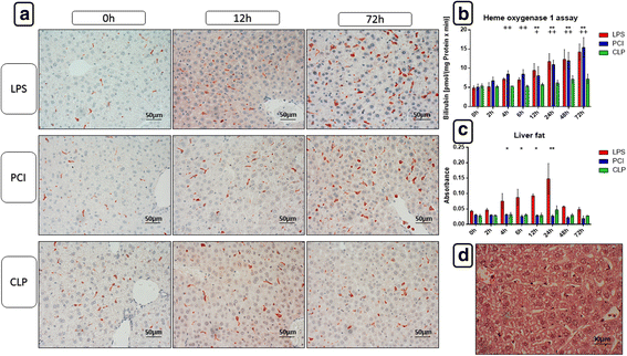 摘要:为了模仿人类的全身炎症,已经研制出不同的动物模型。由于这些模型仍然是有争议的,我们的目的是比较评估最广泛使用的模型对系统的影响,影响器官的功能和潜在的病理生理过程。方法:通过脂多糖(LPS)给药、腹腔污染和感染(PCI)或盲肠结扎穿孔(CLP)对C57BL/6N小鼠治疗诱导全身性炎症反应。在炎症诱导后0, 2, 4、6, 12, 24、48和72小时评估血糖和循环细胞因子水平。此外,还测定了各器官的氧化应激和肝脏的生物转化能力。通过免疫组化法检测肝、脾组织中氧化应激、凋亡、浸润性免疫细胞及细胞因子表达模式。结果:用LPS给药和PCI诱导的小鼠炎症反应非常相似。然而,LPS给药能引起更强的反应。在两种模型中,血清促炎细胞因子水平迅速升高,而血糖下降。器官显示氧化应激的早期迹象,脾细胞凋亡增加。此外,肝脏的生物转化能力降低,肝和脾有明显的免疫细胞浸润。暴露于LPS或PCI的小鼠在72小时后恢复,相反,CLP诱导的炎症反应相对较少,但炎症反应更为持久。结论:当研究急性炎症的新疗法时,全身炎症反应的LPS模型显示最合适。当使用CLP模型模拟人体脓毒症时,给药应采用较长的疗程,因为给药可导致全身炎症的迟发性发展。关键词: LPS PCI CLP 全身炎症反应;氧化应激;细胞因子背景:脓毒症在重症监护病房仍然是一个重大的临床挑战,因为它经常导致多器官功能障碍和高发病率,导致死亡率约为50%。虽然已经制定了治疗潜在感染的既定策略,但迫切需要开发新的治疗方案和确定潜在的候选药物,以预防和打击败血症。为了这些目的,动物模型是非常有用的。为了模仿人类脓毒症的病程,已经研制出各种啮齿类动物模型。这些模型可以分为三大类:内毒素脂多糖(LPS)外源[给药] 外源性病原体的体外给药[接种大肠杆菌],内源性保护屏障破坏[盲肠结扎穿孔模型(CLP)]。这三种模型各有优缺点,其中哪种动物模型最合适,仍存在争议。LPS动物模型具有技术简便、重现性好等优点,特别是在炎症反应中发挥了重要作用。LPS给药后不久,释放出高水平的促炎性细胞因子,并可在循环血清中测定。这导致全身炎症反应综合征(SIRS)和随后的剂量依赖性死亡率迅速发展。然而,LPS模型并没有完全重现人类败血症的特征。LPS可以用来研究内毒素血症或SIRS的病理生理过程,如内毒素休克模型。为了弥补LPS模型的缺点,开发了多种微生物引起的败血症模型。在腹腔感染和感染模型(PCI)中,从健康、非素食捐赠者的粪便样本中分离出各种需氧和厌氧革兰氏阳性菌和革兰氏阴性菌。此外,PCI模型与临床败血症的相关性值得怀疑,因为病人很少有大量菌血症。单一的应用高剂量的细菌引起的效果接近于静脉注射大剂量脂多糖后观察到的结果。使用最广泛的脓毒症是盲肠结扎穿孔(CLP)模型,公认与人类脓毒症有很好的相容性。本研究的目的是全面描述LPS、PCI和CLP小鼠模型在72小时内的特征,包括全身炎症的急性期。为此,诱导了一种不引起急性致死的中度全身炎症反应。因此,没有必要对动物进行任何抗生素治疗或液体复苏,这使我们能够研究这种疾病的自然病程。通过测定血清细胞因子浓度、测定各器官氧化应激参数、追踪脾、肝免疫细胞迁移来评价全身免疫应答。肝功能对患者整体预后至关重要,甚至比肾和肺功能更重要,因此,肝功能参数也被确定。这是第一次直接和全面地比较这三种动物模型,在72小时内,用非致死的方法来研究全身炎症反应对器官功能的影响。本研究的目的是为了更好地理解这些动物模型所涉及的病理生理过程,以帮助研究者选择最合适的模型,并在评价治疗全身炎症反应的候选物时,确定哪些参数对哪一个模型有用。方法:动物和实验方法:成年雄性C57BL/6小鼠(12周龄,体重25–30 g),动物被安置在标准条件下的塑料笼子(光暗周期12 / 12小时,温度22±2°C,湿度50±10%,颗粒饲料自由饮水)。小鼠用脂多糖LPS处理。大肠杆菌,5毫克/公斤体重,溶解在PBS中腹腔给药体积0.1毫升/10克小鼠体重),盲肠结扎穿孔[CLP]。2, 4, 6、12, 24, 48和72小时后所描述的处死动物。在实验开始时(T=0),每治疗组处死四只对照小鼠。这些老鼠没有接受任何治疗。在前几次(试验)研究中确定了最合适的非致死性LPS剂量。小鼠取1.5μg体重的大便,溶于PBS腹腔内给予0.1毫升/ 10克体重,代表非致死剂量。异氟醚诱导麻醉和沿腹白线正中切口切开腹腔,暴露盲肠,在远端与盲肠底之间用不可吸收缝线结扎。随后,使用21g针穿刺盲肠轻轻地压缩挤出少量盲肠内容物。诱导中期的炎症反应,再次缝合腹腔。由于我们对这种疾病的自然病程很感兴趣,因为我们诱发了一种中度的全身性炎症,导致急性致死的可能性很小,在三种动物败血症模型中,没有一种使用抗生素治疗。为了跟踪每个动物模型的病程,在八个不同的时间点进行了调查。0 h(相当于对照组),炎症开始后2小时,4小时,6小时,12小时,24小时,48小时和72小时,处死小鼠(每个时间点处死4 – 6只动物)。在每一个时间点,测量体温,并根据临床严重程度评分(CSS)评估动物的状况,如前所述。每小时评估一次CSS值,并尽一切努力减少动物的痛苦。当动物CSS评分为4时,吸入过量异氟烷处死。所有其他小鼠在所指示的时间点使用同一方法处死。摘取大脑、肾脏、肝脏、肺脏和脾脏,称重,并固定于10%多聚甲醛和快速冷冻在液氮中进行生化分析。小鼠断头后,完全放血,血液收集在凝