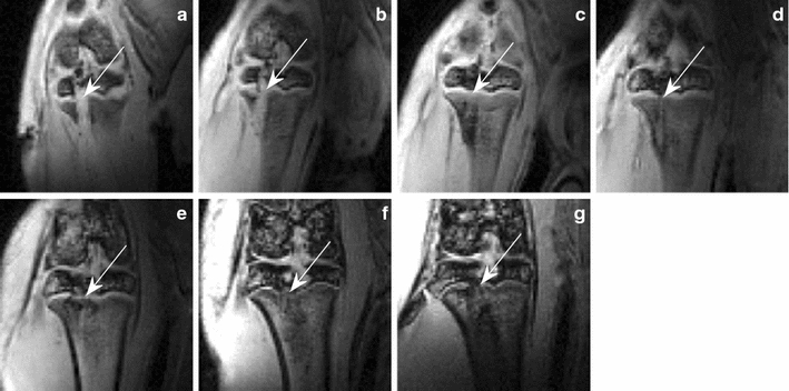 摘要:骨桥形成后发生骨骺病变,如果没有逆转可导致生长停滞。关于这种形成的基本机制的先前研究使用组织学方法。因此,本研究旨在利用动态增强MRI应用微创方法。材料和方法:应用参考区域模型对一组动物模型进行纵向研究评估了与微血管系统相关的功能参数的变化。用三维高分辨率MRI研究受伤的物理形态发展。结果:药动学参数的评价显示转移系数在术后7天首次升高,术后42天最高。对互补数据的分析显示,第一次上升与微血管增生有关,而最大值与骨重塑有关。结论:DCE-MRI的药代动力学分析显示在愈合过程中微血管的增生是骨桥形成的标志。因此,MRI可识别细节,对高侵入性方法进行分析。关键词:造影剂 动物模型 长骨体生长部简介:过早骨骺骨桥形成可以由各种生长毒性包括外伤、感染、辐射、缺血、热损伤、布朗特病、类固醇的使用。一般包括金属植入术医源性损伤是一个骺板骨桥形成的主要原因。骨桥在小的时候可能是可逆的,但也可以触发全部或部分由于过早骨骺闭合不完全分解,因此可能导致全部或部分生长阻滞引起骨长度差异,轴线偏差或关节畸形。临床上,通过X光来检查,这些检查要么常规地记录骨折愈合,要么开始于创伤后骨长度改变或畸形患者。然后,MRI用于记录桥的全尺寸,有助于进一步的治疗。严重的骨骺骨桥改变了正常的骨骼纵向生长,需要手术切除和填补损害自体脂肪组织作为补救措施,或实施对侧固定术或截骨矫正术。此外,干细胞治疗和自体培养的骺板软骨细胞移植是最近研究的新的治疗选择。相比之下,较小的骨桥通常在生长过程中保持隐蔽和消失,而不会影响正常的纵向生长。在各种实验动物模型通过组织学和MR I证实骺板骨桥形成。在骺板骨桥形成之前出现微血管增生。随着入侵血管从周围骨骺和干骺端的骨基质骨祖细胞进入骨骺的病变部位,归因于沉积骨,最终导致骨桥形成。在骺板损伤部位骨桥发展前通过检测血管生成因子表达的增加进一步支持了增加的血液供应是损伤部位与骨骺骨桥血管和微血管侵犯骨组织的发展的基础。然而诱导新生血管形成,紧接着是骺板骨桥形成的潜在病理机制还有待研究。在骨骺病变血供增加检测可以识别早期的骨桥形成,而血管生成因子表达的测定需要组织样本,磁共振成像是潜在的能够提供这种信息的非侵入性方法。动态对比增强磁共振成像(MRI)对微血管系统功能参数敏感。因此它是一种工具来描述血管和微血管并被广泛用于肿瘤的分析。药动学参数识别的典型模型需要组织造影剂(CA)浓度时间信息和血管内造影剂浓度-动脉输入功能(AIF)。采集同一视场(FOV)的骨骺损伤是非常具有挑战性的,确定信号噪声比(SNR)、对比度行为和时间或空间分辨率的界限。本研究的目的是探讨与骨桥形成相关骨骺病变微血管系统药动学参数。这些参数通常在代谢增强的组织中增加,与表面渗透性产物、血流量和血容量有关。这些参数的研究应该支持这一假设,即微血管系统的改变是骨桥形成的基本机制,可以为早期识别这一发展提供定量的措施。方法:动物:77只雄性SD大鼠,体重约100g,一月龄,全身麻醉后进行单侧骨骺损伤。通过胫骨近端骨骺,经正中切口髌腱近端进入钻成1.2mm直径的损伤。术后第0、1、3、7、14、28、和80天时每次处死6只动物取样用于qRT-PCR分析。在1, 3, 7、14, 28, 42和82天各处死五只动物进行组织学观察。在相同的7个时间点用麻醉的动物进行MR测量。在损伤后第一个月内,在短时间内设置研究时间点,以密切注视骨桥的形成和微血管系统的变化。42和82天的长期时间点被确定为进一步的增长观察点,观察骨重塑和检测潜在的骨桥消失。MR测量:用38mT/ m梯度强度的临床3 T扫描仪进行DCE-MRI和形态学的磁共振成像。为了提高图像质量,特别使用直径为18毫米的表面接收线圈。使用如图1所示的布置,可以在整个研究期间保持对大鼠膝盖的最小距离,从而最大限度地提高信噪比。动物被俯卧,膝盖放在线圈的中心。动物放在半圆形动物床提供稳定和可重复的装配。如上所述,在第1, 3, 7、14, 28, 42和第82天进行测量。用高分辨率的三维FLASH序列对被调查区域的形态变化进行成像。组织学:为获得的血管形成互补的信息对近端骨骺,骨骺与干骺端的骨标本进行免疫组织化学分析。组织学标本固定在甲醇(100%)24小时后采用乙二胺四乙酸脱钙(pH 7)两周。在甲醇(100%)中进一步固定12小时,样品在PBS-蔗糖5%溶液中冲洗,用组织冷冻介质覆盖,切成7毫米厚的薄片。可视化的骨骺缺损采用IV型胶原染色血管形成,如IV型胶原是一种血管基底膜蛋白,染色血管呈红色/棕色。结果:扫描显示(用箭头标注),一个有代表性的动物的所有7个时间点的损伤区的物理变化和骨桥的形成,钻后第1天和3天,钻痕造成的骨骺中断清晰可见。第7天骨骺中断消失。第14天时可见最早的骨桥,逐渐被定义为一个更大的低信号中断,这些干扰一直存在直到研究结束。信噪比在两周后有明显的下降:骨骼肌在前14天平均信噪比为82,随后为76。对于骨骺,信噪比从72下降到36的平均水平。组织学研究显示骨骺缺陷区微血管的生长。图显示IV型胶原染色组织切片1, 3, 7天,14, 28, 42和82的骨骺损伤。第1天的染色显示无血管形成。术后第3天和第7天,染色清楚显示毛细血管的存在。两周后,能在骨缺损部位观察到第一骨小梁(IV型胶原阴性,用箭头