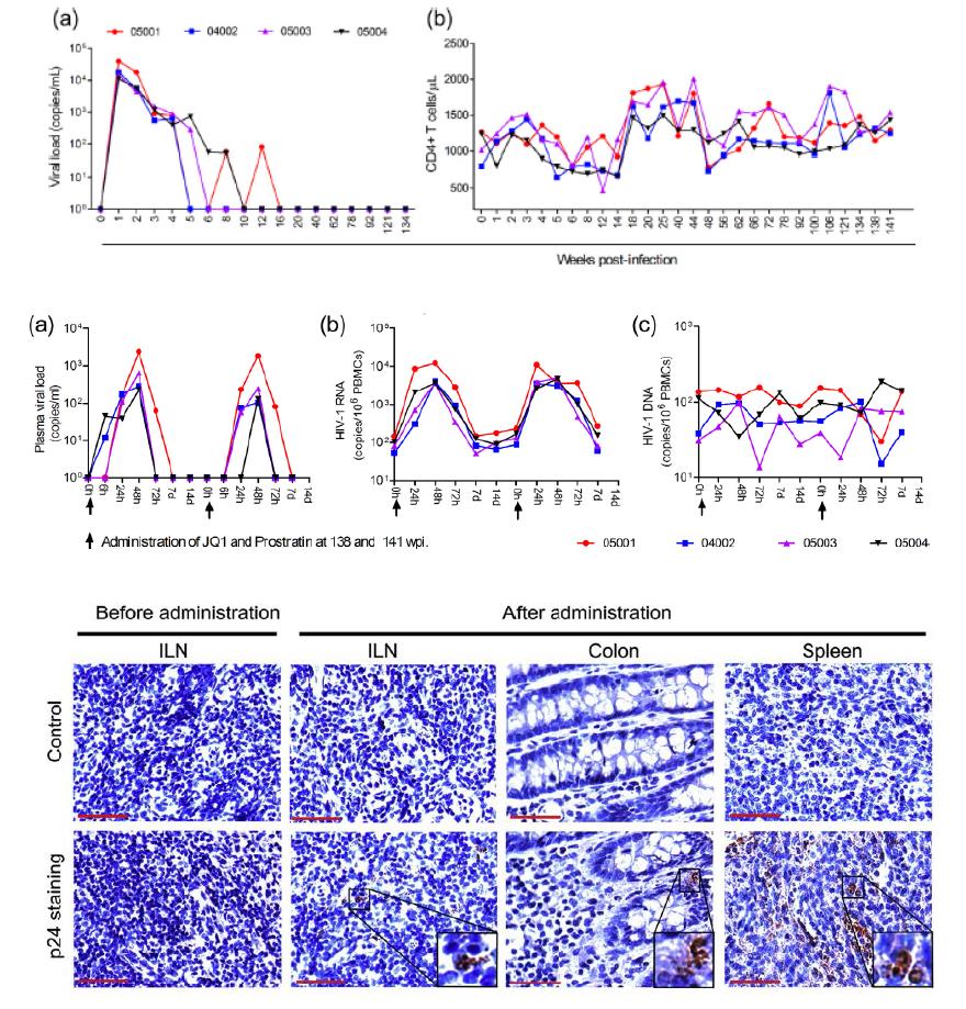 最近,郑永唐研究员学科组庞伟副研究员和张高红博士等人用HIV-1病毒标准株HIV-1NL4.3感染北平顶猴,首次创建了HIV-1感染北平顶猴艾滋病模型。研究结果表明:血浆病毒载量在感染后的第2周达到峰值,8周后逐渐下降至检测线以下,CD4+ T细胞呈稳定性波动。但在研究的3年多时间内,在北平顶猴体内可一直检测到血浆抗体,PBMC细胞中一直可检测到整合病毒的存在和病毒RNA的表达,并从PBMC中能够分离培养获得HIV-1病毒。体外分离感染猴的PBMC细胞和静息性CD4+ T细胞后,用潜伏激活剂JQ1和prostratin可以激活HIV-1 RNA的表达;体内注射潜伏激活剂JQ1和prostratin也可激活HIV-1复制,血浆和淋巴组织中高表达HIV-1病毒。以上实验结果表明HIV-1可在北平顶猴体内呈低水平持续性复制和形成潜伏感染,提示HIV-1感染北平顶猴可能是一种较好的潜伏感染动物模型。
