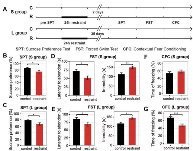 急性应激障碍又称为急性应激反应,是指以急剧、严重的精神打击作为直接原因,患者在受刺激后立即(1小时之内)发病,表现有强烈恐惧体验的精神运动性兴奋,行为有一定的盲目性,或者为精神运动性抑制,甚至木僵。如果应激源被消除,症状往往历时短暂,预后良好,缓解完全。地震等自然灾害不仅会带来重大伤亡,还会影响人们的心理健康。这项研究发表在《科学报告》名为24-hour-restraint stress induces long-term depressive-like phenotypes in mice的文章上。来自上海交通大学李卫东团队注意到严重地震等自然灾害的幸存者是急性应激障碍(ASD)、创伤后应激障碍(PTSD)、抑郁症(Depression)等精神障碍的易感人群。因此,该团队通过模拟地震幸存者被困于建筑物中无法自由活动的状态,成功构建了24小时幽闭的新型抑郁症小鼠模型。随后,他们分别观察了约束发生2天后和35天后的短期影响和长期影响。出人意料的是,老鼠在约束发生35天后表现出了类似抑郁的行为,大脑对葡萄糖吸收减少,成人海马体神经系统发育减缓。他们还在微阵列分析的基础上进行了表达谱差异分析,结果发现,抑郁和其他精神疾病相关的基因和通道在前额皮(PFC)与海马体中都出现差异化表达。不仅如此,这种由24小时约束导致的类抑郁表型可在抗抑郁药物氟西汀的作用下发生逆转。这些发现说明一次严重的压力事件可以造成长期的类抑郁表型。此外,这些24小时约束应激老鼠还可以用在未来的情绪障碍研究中。 - THE END -