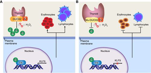 先天性甲状腺激素功能低下症(甲减),是由甲状腺激素分泌不足导致的最常见的内分泌紊乱之一。世界范围内新生儿中发病率高达1:1,400-1:2,800。在临床中,20-60%甲减患者表现贫血或者免疫缺陷等症状,然而分子机制却不明确。尽管甲状腺激素替代是治疗甲减患者的常用方法,然而相关报道表明对于一些严重的甲减且并发贫血的患者而言,通过服用甲状腺激素并不能完全治愈,说明甲状腺激素严重缺乏所带来的损害并不是完全可逆的。