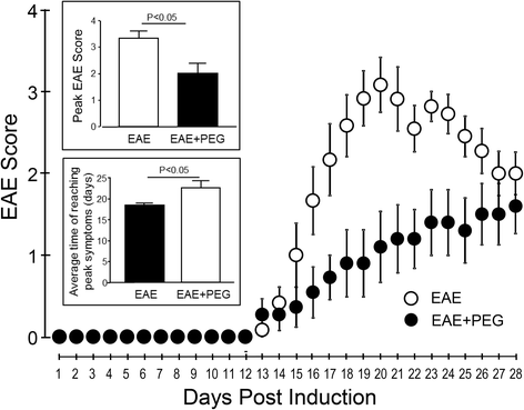 聚乙二醇暂时改善EAE小鼠运动障碍:除了轴突膜透性测试,我们也进行了EAE和EAE+PEG两实验组小鼠行为分析。每天记录每个动物的行为,连续4 周。计算两组平均每天的行为评分,并随时间推移显示。在EAE诱导后16天到25天,EAE /聚乙二醇组行为缺损程度明显低于EAE模型组。PEG处理还显著延迟达峰时间。除了降低峰症状严重程度和延迟到达峰值症状外,PEG处理的动物也表现出延迟症状的发作。特别是在EAE组,所有小鼠在诱导后13到18天之间开始表现出行为缺陷。与此相反,EAE+PEG组揭示了一个更为分散的结果与延迟性趋势。5只EAE+PEG动物同EAE组有大约相同的发作时间(诱导后13-18天)而其他动物都在后来的时间。3只在整个观察期为出现行为缺陷被排除,其余动物在诱导后20-26天出现行为缺陷。总的来说,EAE+PEG组平均发病时间明显滞于EAE组。
