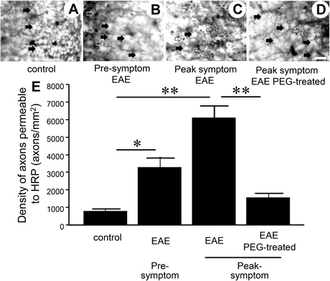 结果:EAE小鼠轴突细胞膜损伤及使用聚乙二醇损伤减少:使用EAE小鼠模型,我们首先检查轴突膜损伤的一个行之有效的辣根过氧化物酶排除试验。对照组小鼠脊髓的轴突膜完整性,EAE小鼠在症状出现前(症状前)和EAE小鼠的峰值行为缺陷(峰值症状)。在这些条件下平均HRP标记分别为811±130轴突/平方毫米,3293±500轴突/平方毫米,和6147±655轴突/平方毫米。与对照组相比,峰值行为缺陷的EAE小鼠表现出更高水平的HRP标记。与对照组相比,症状前EAE小鼠也显示轴突膜通透性增加。我们进一步研究了PEG能降低轴突膜通透性的可能性。EAE小鼠分别给予0.1 毫升聚乙二醇每天注射(30% w/v)(EAE+PEG),或生理盐水(只EAE)从诱导后第一天开始,连续4 星期。在治疗结束时进行了基于HRP排斥试验的轴突完整性分析。我们发现,在EAE+PEG组HRP标记的轴突密度为1581±247轴突/平方毫米,这是显著低于EAE小鼠组。