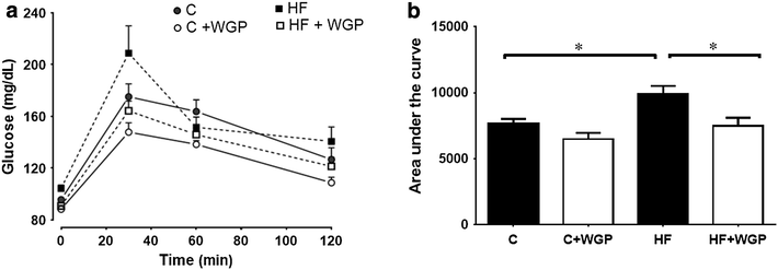 果糖喂养大鼠的葡萄糖耐量试验,WGP防止血糖及曲线下面积升高:在GTT开始前,高果糖饮食大鼠有最高的空腹血糖。在HF组发现在饲喂后30分钟和2小时之间出现最大的血糖增加。值得注意的是HF + WGP组血糖水平略低于对照组,而最低的曲线是C + WGP组。为了量化这些差异,我们测量了葡萄糖耐量试验曲线下面积(AUC)。发现HF组有显著增加,而WGP+HF组中,WGP阻止了AUC的增加。