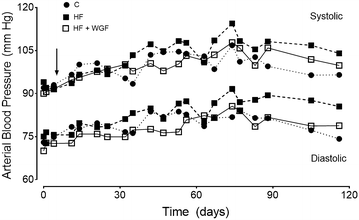 结果:高果糖饲料对大鼠生理指标的影响:12h禁食后,测量发现高果糖饮食增加了血浆中葡萄糖、甘油三酯和胰岛素水平,但没有引起收缩压、体重或心脏重量的变化。添加WGP的HF饮食降低血糖,甘油三酯和血浆胰岛素水平的增加。在一个单独的实验系列,记录了三只植入遥测系统动物饲喂四种饮食后的收缩压和舒张压。各组动脉血压略有增加。然而,所有三只大鼠的动脉血压都有类似的变化趋势。