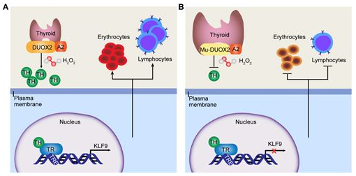 先天性甲状腺激素功能低下症(甲减),是由甲状腺激素分泌不足导致的内分泌紊乱。世界范围内新生儿发病率高达 1:1,400-1:2,800。临床上,20%-60% 甲减患者表现出贫血或免疫缺陷等症状,但分子机制却不明确。甲状腺激素替代是治疗甲减患者的常用方法,然而,相关报道表明对一些严重的甲减且并发贫血的患者而言,服用甲状腺激素并不能完全治愈,这说明甲状腺激素严重缺乏带来的损害并不是完全可逆的。适宜的动物模型对于解析疾病的发病机制,从而研发新药或者开发新的治疗手段至关重要。相较于小鼠等模式动物而言,猪作为大动物不仅与人类器官大小,生理生化等性状相近,在甲状腺激素代谢和免疫等方面与人类更接近。更为重要的是,猪甲状腺可以作为天然甲状腺激素的最主要来源之一,猪适合作为模拟人类甲减的动物模型。在中国科学院院士孟安明、周琪的倡导下,中科院动物研究所牵头成立了“中国猪化学诱变联盟”,利用 ENU 化学诱变技术高效地创制了大量的猪疾病模型和突变体,并发现了一例先天性无毛突变体隐性遗传的家系。研究中,通过表型分析发现该突变体表现为与人类接近的严重甲减特征。基于家系的全基因组连锁分析和全基因组测序定位了致病基因 DUOX2。该基因发生了点突变,即 c.1226A>G 转换导致相应的氨基酸序列 D409G 的改变。利用 CRISPR/Cas9 系统在正常猪中敲除该基因相应的区域,发现突变体表型与 ENU 诱变获得的表型一致,进一步证实了 DUOX2 为该家系的致病基因。DUOX2 协同其成熟因子 DUOXA2 产生 H2O2。在甲状腺甲状腺激素合成中,H2O2 作为甲状腺过氧化物酶的底物,过氧化物酶参与甲状腺球蛋白酪氨酸残基的碘化和碘化酪氨酸的耦联过程,该步骤是甲状腺激素合成中的限速步骤。D409G 突变位于 DUOX2 中的 peroxidase-like 功能域,该突变导致 DUOX2 蛋白稳定性严重下降。体内和体外实验同时证实,该突变使甲状腺中 H2O2 的产生减少。综上所述,由于 D409G 突变破坏了 DUOX2 蛋白稳定性,影响甲状腺中 H2O2 的产生,引发甲状腺激素合成减少。对该甲减猪模型的表型深入研究发现,其同时表现严重的贫血和免疫缺陷症状。为了进一步挖掘甲减和贫血及免疫缺陷之间的分子机制,对胸腺组织进行转录组测序,发现了一个关键的转录因子 KLF9 在突变体的胸腺组织中表达量显著下降。胸腺作为 T 淋巴细胞产生的主要器官,推测 KLF9 可能影响造血细胞的产生。通过体内外实验证实,猪 KLF9 基因在造血细胞中以依赖于甲状腺激素的方式,直接受甲状腺激素受体的调控。为证实 KLF9 作为甲状腺激素受体的直接下游基因是否影响造血的发生,进一步利用斑马鱼模型证实:敲低 Klf9 后,成熟的红细胞和 T 淋巴细胞减少。其可能的分子机制是 Klf9 通过调控细胞凋亡和分裂过程,影响红细胞的成熟和 T 淋巴细胞的生成。该研究工作创制了首例猪甲减模型,并首次发现 KLF9 作为一个关键的因子介导甲状腺激素受体调控造血和免疫细胞的发生,从而揭示了甲减患者贫血和免疫缺陷的潜在原因,为人类甲减的精准医疗研究提供理论支撑;也为培育高免疫力的新品系猪和猪的健康养殖提供了理论基础。论文以 Thyroid hormone regulates hematopoiesis via TR-KLF9 为题在线发表在 Blood 杂志上。该课题得到了中科院战略性先导科技专项、国家转基因专项、国家自然科学基金、国家基础研究计划和 863 计划等的资助。http://www.bloodjournal.org/content/early/2017/09/22/blood-2017-05-783043?sso-checked=true - THE END -