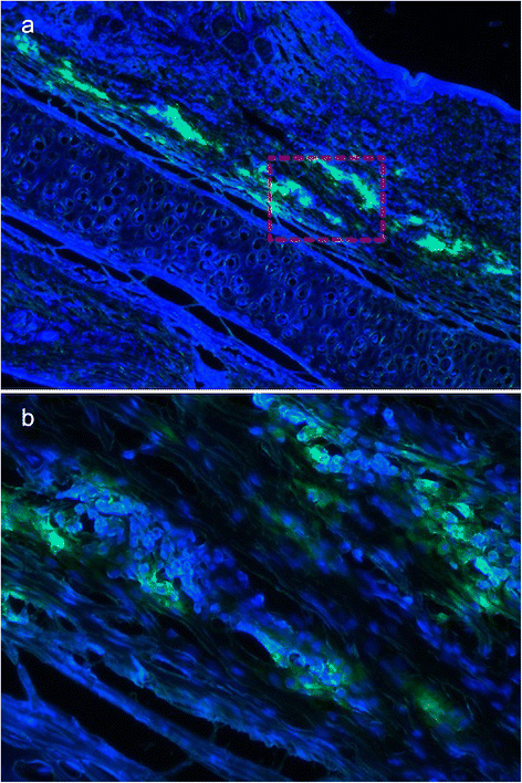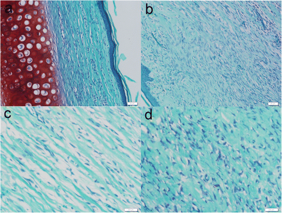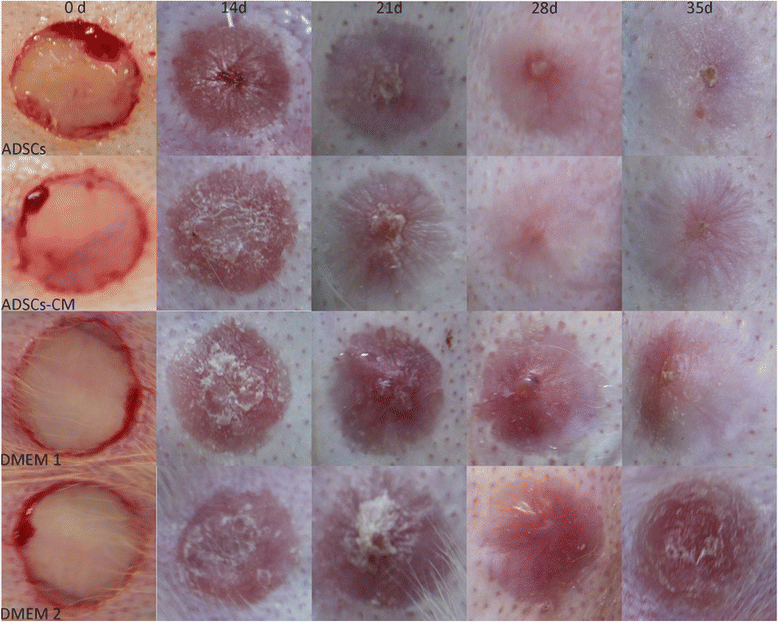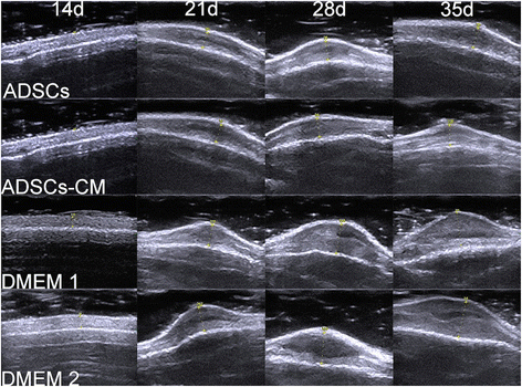 摘要:愈合皮肤伤口处多余的胶原沉积导致增生性瘢痕。脂肪干细胞通过减少胶原沉积而在多种抗纤维化药物中发挥作用。本研究的目的是通过建立兔耳模型探讨注射脂肪干细胞(ADSCs)对增生性瘢痕的影响。方法:将12只新西兰白兔分为三组,每只耳朵上有六个相同的穿孔缺陷。术后14天时,所有的伤口完全再上皮化.第一组在右耳朵接收脂肪干细胞(ADSCs)注射,左耳接受DMEM注射作为对照。第二组兔右耳接受条件培养基培养的脂肪干细胞(ADSCs-CM), 左耳接受DMEM注射作为对照。第三组的右耳未治疗组,左耳接受DMEM注射。使用超声测量术后14, 21, 28天、35天的疤痕抬高指数(SEI)来量化瘢痕增生。35天后采集伤疤进行组织形态学和基因表达分析。结果:瘢痕病灶内注射ADSCs或ADSCs-CM都导致瘢痕外观倾向于正常。与对照组相比,兔耳的SEI显著降低(分别为44.04%和32.48%)。根据形态学和实时定量聚合酶链反应分析证实ADSCs或ADSCs-CM注射病灶内胶原蛋白被有序组织起来,α平滑肌肌动蛋白(α- SMA)和Ι型胶原蛋白表达下降。DMEM注入和未经处理的疤痕之间没有差异。结论:病灶内注射ADSCs通过降低α-SMA、I型胶原基因表达和改善胶原蛋白沉积减少兔耳增生性瘢痕的形成。这可能会导致一种有效和创新的抗瘢痕治疗。简介:真皮组织损伤后,由于细胞外基质沉积和重塑异常,尤其是胶原,可引起增生性瘢痕。这种疤痕组织通常是由于发痒、疼痛和发红而变得僵硬,引起患者显著的外观和功能的问题。有各种各样的增生性瘢痕治疗方法包括切除、病灶内类固醇注射、压缩、激光、干扰素注射。然而,这些疗法都没有被证实能有效避免过度瘢痕组织的形成和健康真皮组织的再生。因此,肥厚性瘢痕的治疗仍然是一个挑战。增生性瘢痕是由于伤口愈合过程中的特定因素引起的,包括炎症、增生和重塑。T细胞和巨噬细胞的免疫功能紊乱,伴随着广泛的炎症反应,可形成空洞填充、非功能性组织,导致瘢痕的演变。活性氧(ROS)也是胶原沉积的有力驱动因子,它是中性粒细胞分泌的一种高度细胞毒性化合物,用于伤口消毒。转化生长因子β1(TGF-β1)是一种已知的真皮纤维化助推器,是成纤维细胞中重要的胶原刺激因子。此外,TGF-β1抑制基质金属蛋白酶(MMP)的表达,导致创面内胶原纤维的积累。肌成纤维细胞分化是在创伤愈合过程中的另一个纤维化增强器。肌成纤维细胞,在损伤环境成纤维细胞分化,是为了缩小伤口的边缘通过收缩加速再上皮化。紧张,过度,和不规则排列的胶原纤维束导致过度增生的增生性瘢痕。长时间的伤口愈合通常会导致增生性瘢痕。愈合过程中,确保形成一个适当的微血管网络和发展成为一个永久的血管网络是非常重要的。否则伤口闭合会受损,增生性瘢痕会出现。在伤口愈合过程中,任何异常都会对组织再生产生负面影响,并有助于增生性瘢痕的形成。从治疗的角度来看,治疗创伤愈合期间异常的药物可能有助于治疗疤痕。脂肪干细胞(脂肪干细胞)治疗有希望通过减少炎症的方法防止纤维化,抑制TGF-β1,有利于伤口部位组织再生。方法:兔耳增生性瘢痕模型:12只成年新西兰白化兔(每只重2.5~3公斤)在无菌条件下进行麻醉,以制备创伤。使用环钻在每只耳朵的腹面裸露的软骨处制备6个圆形,1厘米的伤口,表皮、真皮、软骨膜被小心地取出。伤口上覆盖着红霉素眼膏,第二天清洗分泌物。这项研究排除了感染性或坏死性伤口的样本。脂肪干细胞的制备及条件培养基:处死四周龄新西兰白兔,收集腹股沟脂肪垫,切碎,0.075% I型胶原酶37℃消化,持续振荡45分钟。1200×g将细胞悬液离心10 min.将脂肪细胞用含10%胎牛血清(FBS),1%青霉素/链霉素的低糖DMEM培养基悬浮,并在37°C含95%的空气、含5%的CO2的环境下培养。3天更换一次培养基。六孔板被用来播种ADSCs(约5×104 cells/cm2)。播种后十六小时,常规培养基被不含胎牛血清的DMEM培养基被取代。最后,孵育48 h,收集培养上清,300×G离心5分钟,通过0.22微米过滤器过滤。鉴定ADSCs:流式细胞仪检测细胞,第三代的ADSCs与单克隆抗体孵育PE标记的CD34、CD105、CD73、HLA-DR抗体或FITC标记的CD14、CD90、CD45抗体在室温条件下孵育30min。同型对照抗体染色的细胞为对照。细胞用磷酸盐缓冲液(PBS)洗涤,随后用4%甲醛固定,并用FACScan流式细胞仪分析。并根据以往方法评估脂肪形成和分化。病灶内注射:收集第三代的脂肪干细胞,用DIL标记。脂肪干细胞用PBS洗两次,悬浮在Dil稀释液(5μL/m DMEMl培养基),并分别在37°C培养 20分钟。孵育后,重新冲洗两次和悬浮在低糖DMEM培养液。用29G注射器从伤口边缘慢慢将含四百万脂肪干细胞的0.2毫升DMEM培养液注入每个病灶的中心。同样将0.2毫升ADSCs-CM注入每个病灶的中心。疤痕评价:手术后每周都要观察伤口的外部变化。术前、术后2, 3, 4周、5周超声检查病变的声像图,记录瘢痕的内部变化。组织学分析:术后35天取疤痕进行组织学检查。将他们立即固定于10%福尔马林。然后将瘢痕植入石蜡切片。对于疤痕抬高指数(SEI),切片用HE染色,显微镜下检查。测量由盲检查者进行两次,并使用平均值。胶原纤维排列进一步进行马松三色染色法。追踪脂肪干细胞:瘢痕组织一分为二,4°C固定于含10%蔗糖的4%多聚甲醛12 h,然后在含30%蔗糖4%多聚甲醛溶液中固定24小时。然后将标本植入OCT复合物中并存储在-80°C直到使用。切成10um的切片,并用PBS冲洗3次,空气干燥10分钟