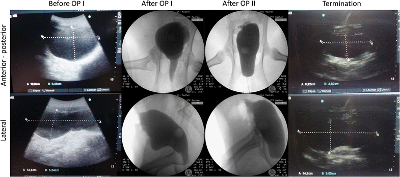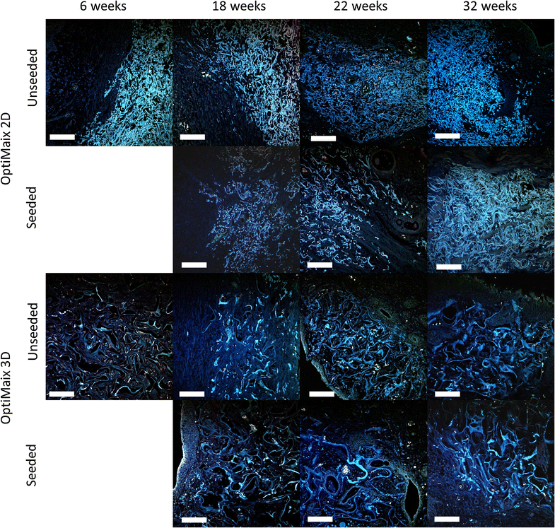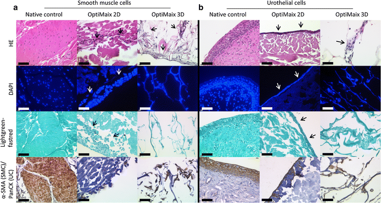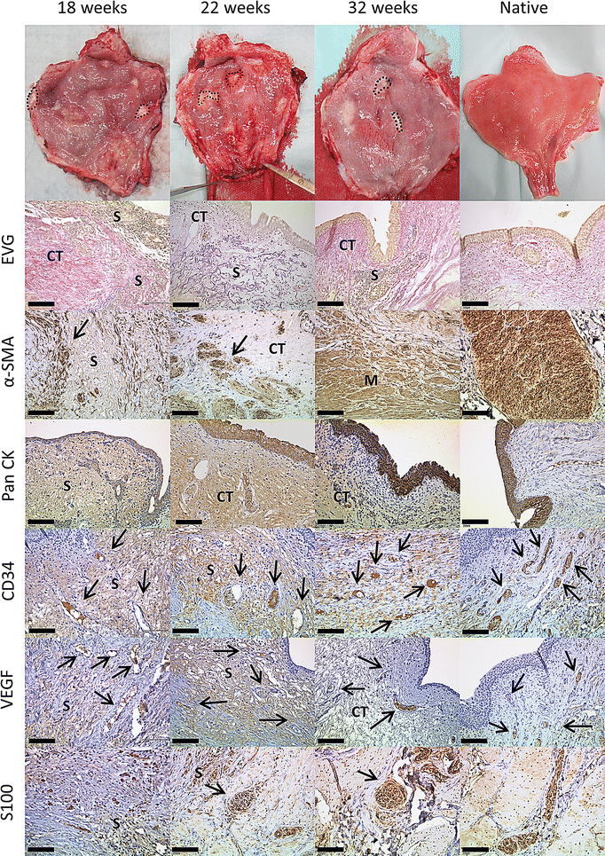 背景:由于癌症、外伤或先天性畸形导致组织丢失,膀胱组织的修复是必要的。肠组织的使用仍然是泌尿外科临床上的金标准,但其导致新的问题和功能障碍,如粘液生成,结石形成,严重的是恶性肿瘤。因此,人工生物衍生材料使用是增强这种特殊组织的一个很有前途的步骤。本研究的目的是通过两个胶原支架原型来研究膀胱壁的修复,optimaix 2D和3D,天然和种植自体膀胱细胞。方法:6头小型猪进行膀胱镜手术,组织活检和细胞分离后增加支架植入术。第一次手术六周后,接种组织培养的自体膀胱和逼尿肌细胞连同支架一起植入膀胱。进行膀胱造影和膀胱超声检查显示结构完整性和植入部位的渗漏试验。18、22、32周分别处死2头猪,通过不同的(免疫组织化学)染色程序和双光子激光扫描显微镜检查泌尿系统。结果:两个胶原支架在体内膀胱壁有良好的组织生长能力,能快速连接尿路上皮细胞。随着支架的降解,逼尿肌组织向内生长,在整个研究期间都能观察到。结论:胶原支架optimaix 2D和3D是替代膀胱壁的一个潜在材料。该材料具有良好的生物相容性,在体外具有良好的自体细胞生长,并能很好地整合到体内的膀胱组织中。关键词:组织工程 膀胱 胶原支架 自体细胞种植 大动物模型方法:试验设计:6头雌性SPF级小型猪,月龄17.8±1.0,平均体重44.8 ± 3.9 kg.购入后接收兽医临床检查。所有动物在试验前至少要驯化14天。第一操作(OPI),两个optimaix 2D和两个optimaix 3D没有细胞植入到小型猪的腹膀胱壁。切除的膀胱组织进行分离和UCS、SMCs组织培养。3周后支架与自体组织培养的UCS和SMCs一同植入,植入前三周内支架在保温箱中。第二操作,植入的optimaix 2D和optimaix 3D中的一个支架被去除,被一个合适的、新鲜的相同规格的天然2D或3D支架替换。6周后初步评估植入-宿主融合情况。两细胞种植的optimaix 2d支架复合物植入右背部膀胱壁,一个细胞种植的OptiMaix 3D支架植入左背部膀胱壁。在第二操作后18, 22和32周每次处死两头猪,检查泌尿系统。根据支架制造商的设想,植入后14-15周支架被降解完全。相反,人造胶原块仍然可以找到。通过在一个动物中执行两次操作,可以根据3R原则获得更多有关植入宿主组织整合的时间尺度的信息。手术操作:植入前optimaix 2d支架进行适当的裁剪以适应定制的,椭圆形的聚四氟乙烯播种环(3.3平方厘米)。这种预切法与第二次手术中植入的支架进行比较是有基础的。高孔隙(孔径≈100?m)optimaix3D支架被证明是脆弱的,容易损坏,因此需要一个更大的表面来缝合。支架,因此,植入和缝合的交付格式3×4 cm2。术前肌内注射4mg/kg的氮哌酮和0.1mg/kg的阿托品。15分钟后,肌肉注射氯胺酮,10mg/kg。取所有动物血样进行常规血液计数。静脉注射1mg/kg丙泊酚后,动物进行插管麻醉,异氟醚吸入量维持在1 - 1.5Vol%。持续输注芬太尼(0.02毫克/千克)给予镇痛. 在开腹手术过程中,给予0.9%氯化钠溶液输液补偿,速率4 ml/kg h.对手术部位进行清洗消毒后,在下腹中线进行切口。经尿道导管和膀胱被抬高,高于联合处,用200毫升0.9%氯化钠溶液填充。用手术刀和剪刀锋利地解剖指定植入部位的尿路上皮和逼尿肌组织同时创造一个浆膜瓣。支架的大小相当,被转移到含有预热过的改良Eagle's培养基无菌杯中,然后立即放入细胞培养设施中进行处理。胶原支架植入并用可吸收缝线PDS II 4-0固定在所制备的病变部位。不可吸收标记缝线聚丙烯3-0黑色用于2D支架四角,蓝色用于3D支架四角。剩下的浆膜瓣用支架覆盖和PDS II4-0固定。然后用0.9%氯化钠溶液填充膀胱检查渗漏情况。用Vicryl 2-0缝合腹膜、肌肉和皮下组织,Prolene 2-0缝合皮肤。放置一个新鲜的经尿道导管,以避免对愈合的膀胱组织压力。预防性应用抗生素每日两次,卡布洛芬每日一次口服镇痛连续五天。手术后护理:每天检查动物的健康状况。一周后通过造影对膀胱的完整性进行评估。猪被镇静后,高达350毫升的放射性造影剂经尿道导管注入膀胱。如果有泄漏,一个新鲜的经尿道导管留在膀胱,直到1周后第二次随访。对拔除尿管后的猪,在笼内观察24小时的正常饮食和饮水。这种监测也在每次手术之前和之后及终止膀胱功能评估的实验进行。通过视频监控保证排尿时间点和排尿量的大小,一种泌尿外科流量计,由刻度盘和收集容器和相应的软件组成。UCS和SMCs细胞培养:如前所述分离自体UCS和SMCs。尿路上皮和膀胱逼尿肌被从膀胱分割下来进行机械分离细胞。轻轻搅拌后(1小时37°C)库中的在含400ug/ml胶原酶的MEM培养基中37度孵育1h后,轻轻搅拌,用含10%(v/v)胎牛血清的MEM洗涤三次,转移到胶原涂层细胞培养瓶中。UCS在角化细胞- SFM培养中培养,SMCs在选择培养基中培养。选择培养3天,抑制SMC中成纤维细胞的生长。SMCs用平滑肌细胞生长培养基2培养。对培养的细胞定期检测。细胞种植和OptiMaix支架植入:optimaix 2d支架固定在定制的播种环中接种SMCs细胞。Optimaix3D支架平放在培养皿中,然后接种细胞。培养4小时后,培养皿中加入20%的FCS,1%的两性霉素B和1%的庆大霉素。共培养,一天后,SMC种植支架被放置在一个新的培养皿和UCS被种植在支架的另一面。每种类型的额外的支架被接种作为细胞生长的控制组。培养基每隔一天换一次。支架的组织化学和免疫组化染色:一周2次(D1和D4),3mm厚的种植对照组支架被切断,并固定在carnoy' S溶液中4h。固定样品通过提升乙醇浓度脱水,