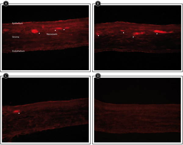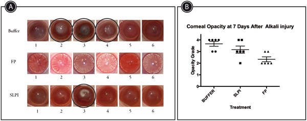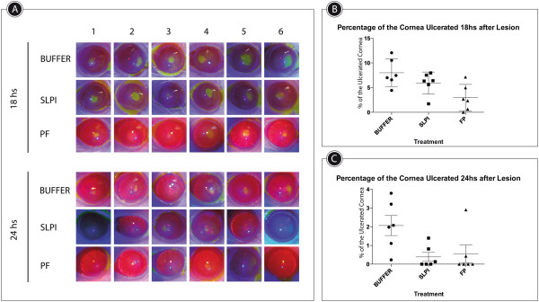 摘要:研究局部给药的,由蛋白酶抑制剂中的N-末端部分和SLPI(有抗炎、抗菌和抗病毒能力的蛋白)结合的融合蛋白对角膜炎症和新生血管动物模型的抗菌和抗病毒能力。方法:在全身麻醉情况下,对36只雄性SD大鼠右眼角膜用1M NaOH碱, 40秒损伤3毫米。动物按治疗分为三组。1组用10UL pf-mc治疗(200微克/毫升;N=12),2组用10UL SLPI(200微克/毫升;N= 12)和3组用10μL缓冲液(N= 12)局部给药一天四次,连续7天。一半的动物处死前3天用荧光素染色18和24小时制作再上皮化时间分析。余下的动物在安乐死前7天对角膜混浊进行研究和拍摄数字照片。眼睛进行组织学和免疫荧光处理。结果:pf-mc处理的动物,角膜溃疡面积明显低于SLPI和缓冲处理的动物。仅在pf-mc治疗动物组发现透明角膜和眼底红光反射。组织学分析显示在第7天所有pf-mc组动物发现至少三层角膜上皮细胞。该组第3天和随后的天数,角膜基质中中性粒细胞数量减少。此外,SLPI和缓冲液处理组同pf-mc治疗组动物相比,角膜新生血管增生。结论:SLPI与谷氨酰胺转胺酶的融合蛋白似乎是治疗角膜的炎症和血管生成的有效策略。关键词:SLPI 转谷氨酰胺酶 角膜新生血管 血管再生 NFKB 角膜炎症背景:类固醇在角膜炎症性疾病中的应用相当普遍。肾上腺皮质激素长期使用能产生眼部副作用如青光眼、白内障和影响角膜上皮。因为这些问题其他抗炎药物正在测试,如生理的丝氨酸蛋白酶抑制剂因子SLPI(分泌性白细胞蛋白酶抑制剂)。这些药物抑制中性粒细胞(PMN)弹性蛋白酶活性,也抑制转录因子NFKB阻碍促炎基因活化的核易位。蛋白酶抑制作用在蛋白酶对炎症部位组织损伤的控制中起重要作用。伤口愈合和炎症性疾病蛋白酶和抑制作用之间的严格平衡是必不可少的。不平衡导致各种炎症性疾病如乳腺增生症、慢性支气管炎、肺气肿。SLPI是一种低分子量的蛋白质,被确定为黏膜分泌的蛋白酶抑制剂。近年来,本实验室研究了SLPI在几种炎症过程中作用。SLPI治疗不易维持,因为其在血清中的半衰期较短。为了提高SLPI生物活性功能,本实验室对其进行了分子水平上的修改。转谷氨酰胺酶(TG)是9个酶组成,催化游离胺和酰基之间异肽键的形成。这些酶参与,如炎症、再上皮化,新生血管和纤维细胞外基质合成的过程。TG2位于细胞核,细胞质基质和膜室。TG2在炎症部位表达,激活磷脂酶A2,NFkB和MAPK刺激炎症反应。它也涉及伤口愈合、翼状胬肉、干眼和过敏性结膜炎等的病理生理学。因此,有一个很强的假设,抑制TG2可能有利于角膜至少在某些点的炎症过程。SLPI基因融合的蛋白酶抑制剂中的N-末端部分,作为一个融合蛋白的重组表达,定为pf-mc。该融合蛋白能锚定在不同的地点的TG2的表达。它允许SLPI分子作用在局部,并可能增加蛋白的半衰期。角膜受伤对眼睛造成非常严重的伤害。造成炎症和释放胶原酶和蛋白酶,严重损害角膜组织。NFKB通路的抑制,被炎性细胞因子激活,可能会减少炎症过程的幅度,促进伤口愈合。为了这个目的,我们的目的是评估上述的融合蛋白对角膜碱损伤大鼠模型的局部效果。方法:36只雄性SD大鼠,12周龄。这些动物经筛选不存在任何的眼病变。采用异氟醚全麻后,在右眼角膜中央部位,使用用1M NaOH碱, 40秒损伤3毫米。然后,眼表用5毫升的生理盐水轻轻冲洗洗。动物根据治疗方法分为三组:1)pf-mc(200μg/ml);2)SLPI因子(200微克/毫升),3)洗脱缓冲液。治疗局部应用10 UL每天四次。首次给药在造成损伤后30min时。每个组有六只动物分别在病变3,7天时处死。PF-MC制备:pf-mc重组蛋白的纯化与表达在BL21大肠杆菌中制备。细菌的颗粒被溶解,超声、离心。可溶部分的回收和增加一列镍氨三乙酸(Ni-NTA)pf-mc蛋白在柱中加入2毫升50 mM磷酸,300 mM NaCl,250 mM咪唑洗脱;pH=8.减少蛋白质样品的咪唑浓度,用终浓度为2.5 mM磷酸盐缓冲液进行透析。在4°C进行隔夜透析,和随后的蛋白回收和分装以及透析缓冲液。蛋白质pf-mc采用琼脂离心回收。蛋白质浓度的定量用microBCA试剂盒分析。角膜上皮修复时间的评价:通过角膜的荧光染料染色对损伤后的角膜进行角膜再上皮化分析。上皮缺损保留染色区,无染色区域完成再上皮化过程。每一组六只眼用荧光素染色检查,每6小时,在钴蓝色的显微镜下检查。伤后18和24用数码相机拍摄。用Adobe PS图象处理软件规范角膜大小尺寸的彩色区域的像素,计算角膜溃疡的百分比。角膜混浊度评价:第7天,用裂隙灯显微镜观察角膜混浊。简单地说,0级:完全透明角膜没有一丝混浊。0.5级:由斜照明检测到微弱薄雾。1级:轻度混浊但不干扰虹膜的可视性。2级:比较突出的混浊与虹膜轻度遮挡。3级:中等密度不透明,遮挡部分虹膜。4级:完全不透明,前房结构不可见。组织学检查:第3天和7天时,处死动物。摘取眼球,剥离角膜。然后,对角膜进行15微米切片和HE染色。显微镜检查每个角膜的四个部分。角膜的评价包括角膜上皮细胞的形态和层数;间质细胞计数和新生血管定位识别。由两名人员进行分析。新生血管的形成分析。根据角膜示意图从上皮到内皮细胞分类将新生血管分为浅,中,深。新生血管的扩展根据显微领域从边缘到中心的角膜含有血管的数量记录。免疫荧光分析:伤后7天对大鼠进行安乐死,摘取角膜,固定于4%多聚甲醛6h,然后被浸泡在4种浓度的葡萄糖溶液中(5%,7.5%,10%,20%)过夜。用液氮冷冻。15微米厚的切片在4°C同抗小鼠血管内皮生