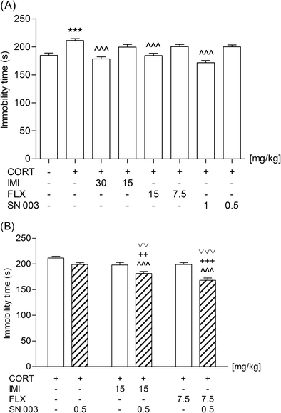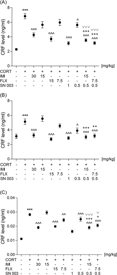 简介:下丘脑-垂体-肾上腺轴(HPA)过度活跃和中枢促肾上腺皮质激素释放因子(CRF)系统受损是抑郁症发病的诱因。虽然在几个公认的行为测试中CRF1受体拮抗剂抗抑郁活性有效,CRF1受体抑制剂和传统的抗抑郁药物之间潜在的相互作用仍知之甚少。我们研究的目的是评估sn003,CRF1受体阻滞剂,抗抑郁药物丙咪嗪和盐酸氟西汀对有抑郁症状在大鼠强迫游泳试验(FST)中的活性影响。雌性wistar大鼠, 14天皮下注射皮质酮(CORT)(20毫克/公斤/天)。抗抑郁药的作用是由FST和下丘脑、杏仁核和外周血CRF水平由高灵敏度免疫酶试验确定。sn003(0.5 mg/kg)增强丙咪嗪(15毫克/公斤)和氟西汀(7.5毫克/公斤)的抗抑郁作用。两测试试剂的共同使用,取消CORT所致CRF水平增加。我们目前的发现进一步证明了CRF活性的抑制可能有助于治疗情绪障碍。抗抑郁药与CRF1受体拮抗剂同时使用,在安全性方面是有益的,因为它使用较低剂量的药物。关键词:CRF1受体拮抗剂 丙咪嗪 氟西汀 强迫游泳实验 促肾上腺皮质激素释放因子水平 大鼠简介:观察到抑郁症患者下丘脑-垂体-肾上腺轴(HPA)的过度活跃,被认为是该病发病机制中的一个重要因素。虽然HPA轴对内分泌应激反应至关重要,促肾上腺皮质激素释放因子(CRF),也被称为促肾上腺皮质激素释放激素,在调节神经内分泌反应中起重要作用。CRF在下丘脑室旁核小细胞神经元作为一种激素,而CRF在大脑的其他区域产生作为一种神经递质。在紧张的情况下,观察到CRF合成和释放增加,这反过来又触发的促肾上腺皮质激素(ACTH)的释放,其次是较高的合成及糖皮质激素皮质醇的释放(灵长类动物)和皮质酮(啮齿类动物)。在健康受试者中,糖皮质激素会产生负反馈,导致CRF、促肾上腺皮质激素和皮质醇/皮质酮的合成和释放减少。在抑郁的受试者中,HPA负反馈回路可能受损。CRF水平升高不仅导致神经内分泌改变,而且也影响到与应激反应相似的行为和生理变化(增加心率、失眠、抑制陌生环境中的探索行为、疏导行为、性兴趣和食物摄入下降)。CRF的作用通过两种不同的CRF受体(CRF1和CFR2),参与焦虑和抑郁相关行为的调制。特别是给定的CRF1受体作为潜在的抗抑郁活性物质的目标。高CRF1受体密度在大脑皮层,小脑、嗅球、海马、杏仁核、内侧隔核、垂体被发现。CRF1受体拮抗剂是公认的对行为测试(即大鼠强迫游泳试验,FST;悬尾实验,TST)和动物模型(慢性应激模型,慢性青少年应激)评价抗抑郁新的药物作用有效。在我们以前的研究中,我们还发现一个高亲和力的非肽类CRF1受体拮抗剂,显示> 1000倍的选择性CRF2受体-sn003-具有抗抑郁活性。非肽类化合物似乎具有特殊的价值,因为基于肽的CRF受体拮抗剂是不能通过血脑屏障渗透的。对CRF1受体阻滞剂的抗抑郁疗效的临床试验的患者因不良反应停止。观察到的作用与帕罗西汀(即选择性5-羟色胺再摄取抑制剂)的作用相当,停药后的情感症状明显恶化。现有资料表明,CRF1受体阻断可能成为治疗抑郁症的另一个策略。对CRF1受体和常规抗抑郁治疗的抑制剂之间的相互作用知之甚少。我们决定评估sn003对丙咪嗪(三环类抗抑郁药)和氟西汀(一种选择性5-羟色胺再摄取抑制剂)在皮质酮(CORT)处理大鼠FST试验中的活性的影响。sn003,作为CRF1受体抑制剂完全拮抗CRF效果。最近发现,sn003有双重作用,即,除了抗抑郁药的潜力还降低逼尿肌反射亢进的症状。从临床的角度来看,这种化合物的特性是非常重要的,因为膀胱过度活动症和抑郁症常常共存,并对生活质量产生重大影响。在目前的研究中使用CORT抑郁症模型。14天的CORT治疗组大鼠导致循环血清CRF水平升高,从对照组的6.41 ± 0.28 pg/ml升高到给药CORT组(20毫克/公斤/天)的23.39 ± 1.13 pg/ml。长期用糖皮质激素处理的大鼠可能是测试CRF拮抗剂作用的一个非常有趣的模型。材料和方法:动物:雌性Wistar大鼠,体重200-225克,12/12光/暗周期,温度22±1°C,湿度60%。动物自由采食和饮水。将大鼠随机分为10个实验组,每组13~15个:第一组(对照组)给予生理盐水14天;第二组皮质酮(20毫克/公斤/天)给药14天;第三组皮质酮(20毫克/公斤/天)14天,加丙咪嗪(30毫克/公斤);第四组皮质酮(20毫克/公斤/天)14天,加丙咪嗪(15毫克/公斤);第五组皮质酮(20毫克/公斤/天)14天,加氟西汀(15毫克/公斤);第六组皮质酮(20毫克/公斤/天)14天,加氟西汀(7.5毫克/公斤);第七组皮质酮(20毫克/公斤/天)14天,加上sn003(1毫克/公斤);第八组皮质酮(20毫克/公斤/天)14天,加上sn003(0.5毫克/公斤);第九组皮质酮(20毫克/公斤/天)14天,加丙咪嗪(15毫克/公斤),加上sn003(0.5毫克/公斤);第十组皮质酮(20毫克/公斤/天)14天,加氟西汀(7.5毫克/公斤),加上sn003(0.5毫克/公斤)。药物:使用下列药物:皮质酮(CORT)、丙咪嗪(IMI),氟西汀(FLX),和sn003。在前期实验的基础上,选择了剂量和预处理方案。CORT,IMI和FLX分别溶于生理盐水,sn003溶解在积约100μL的二甲基亚砜(DMSO),稀释于生理盐水,导致最终浓度约为1%的DMSO。CORT(20毫克/公斤/天)或生理盐水皮下注射(SC)14天,IMI(15或30毫克/公斤)和氟西汀(7.5或15毫克/公斤)腹腔注射(ip),sn003(0.5或1毫克/公斤)静脉注射(IV)。除了皮质醇药物均给予单剂量。最后一次皮质醇给药后48小时及IMI、FLX或sn003注射后60 min。所有给药溶液的体积为10毫升/千克。强迫游泳实验:FST是按照前面描述的方式执行的。起初,动物被单独放入玻璃缸(高度65厘米,直径25厘米),含48厘米的水(23 - 25°C),并在那