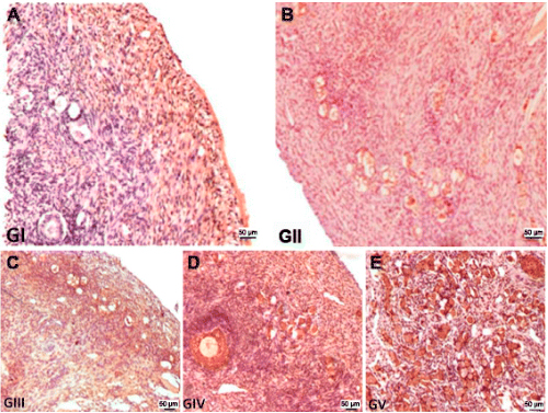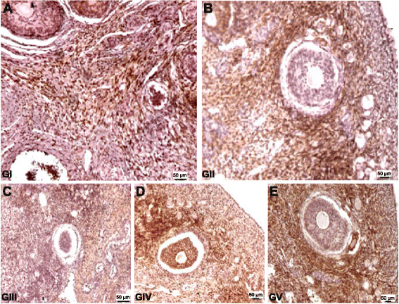 摘要:背景:卵巢移植作为生育和内分泌功能保护的临床方法已显示出越来越多的期望。然而,有关这种类型的移植成功率的信息是有限的。假设,卵巢移植的部位不同结果不同。为了检验这一假设,新鲜或冻存卵巢条进行自体同位或异位移植。收集移植后的卵巢条,评价选择的细胞凋亡的标志物的形态和表达。我们比较了新鲜自体移植和冷冻保存的卵巢带放置在小型猪同位和异位部位Bax、Bcl-2和Caspase-3染色程度和形态。方法:四十头雌性猪随机分为以下五组:组一,切除卵巢的卵巢组织;组二,新鲜卵巢带移植至异位部位;第3组,新鲜卵巢带移植到同位,第4组,冷冻保存卵巢带移植到异位部位;第5组,冷冻保存卵巢带移植到同位。卵巢移植后的第7天,收集卵巢带,评价细胞凋亡标志物的形态和表达。结果:对所有的组,检测卵泡发育的各个阶段。各组原始卵泡、初级卵泡、次级卵泡的数量类似,但在冷冻保存组与新鲜卵巢组织相比,窦状卵泡的数目较低,新鲜和冷冻保存组移植组之间没有显著差异。所有移植组Bcl-2表达降低,Bax表达高于对照组。此外,在新鲜腹腔移植中检测到凋亡标志物的表达增加。冷冻保存的原位组与异位组相比,裂解caspase-3表达明显增高。结论:选择使用这些技术原位和异位卵巢条移植是可行的。更重要的发现是,异位移植在更大程度上比原位移植保留卵巢滤泡完整性(即,凋亡标志物的低表达),和冷冻保存不会加剧细胞凋亡的标志物的表达。这些发现有重要的临床应用,并加强异位移植卵巢组织的讨论。关键词:卵巢移植 凋亡 小型猪 裂解caspase 3 卵泡数背景:卵巢组织移植可用于保留经历卵巢早衰和不孕妇女的生育能力和卵巢功能。每年有越来越多的妇女患上癌症。因此,人们越来越关注各种细胞毒性治疗对性腺功能的影响。目前的保留生育替代品,卵巢组织移植不同于胚胎和卵母细胞冷冻保存。因为它是唯一的方法,可以给青春期女孩提供和实现不处理的任何延迟。这种技术可以使用新鲜或冷冻保存的组织在原位或异位部位的移植。在一般情况下,自体卵巢移植比异体移植较常见由于免疫抑制问题。然而,移植排斥反应,通过细胞凋亡或坏死,甚至可以发生在自体移植。细胞凋亡排斥反应的机制在很大程度上仍然未知。卵巢移植中细胞凋亡的研究进展表明这个过程中参与移植。我们研究评估使用新鲜和冷冻组织在不同的植入部位研究评估细胞凋亡。卵巢移植的研究主要是实验性的,涉及的评估周期短。此外,这些研究使用一系列不同的技术在小动物模型上开展,卵巢组织移植虽然是一项相对较新的技术,但具有很大的发展前景,需要进一步研究,以规范技术,拓宽临床应用前景。鉴于小型猪宏观特性观察类似人类生理,该动物模型被用来评估卵巢种植体,无论是新鲜或冷冻保存,原位或异位移植后的可行性。我们推测,根据移植部位移植组织的质量和生存能力会有所不同。因此,本研究的目的是评价卵巢条非冻存卵巢(控制)或在非冷冻或冻存卵巢原位或异位移植部位组织形态和细胞凋亡三标记物的表达(Bcl-2、Bax和caspase-3)。方法:实验动物:40头雌性小型猪,动物年龄6月龄到1岁,平均体重为24.5公斤。动物已经经历了至少一个发情周期,以确保他们在生殖发展阶段。小型猪均保持12 h光暗周期和-免费提供水和食物。经过三天的驯化,每个动物接受合成孕激素周期18天,5天后,动物随后接受随机分组。研究组:动物随机分为五组(n = 8):GI,动物仅行腹腔镜双侧卵巢切除术,其中卵巢组织被切除作为对照组;GII、动物行双侧卵巢切除术和新鲜卵巢组织自体立即移植到皮下组织(异位移植);GIII、动物行双侧卵巢切除术和卵巢组织自体移植新鲜立即围漏斗腹腔部位卵巢区(原位移植);GIV,动物行双侧卵巢切除术和随后的自体冷冻卵巢组织移植到皮下组织(异位移植);GV、动物行双侧卵巢切除术和随后的自体冷冻卵巢组织移植到围漏斗腹腔卵巢区(原位移植)。卵巢切除术:腹腔镜双侧卵巢切除术,使用Stryker内镜设备鉴定卵巢蒂和子宫卵巢韧带,夹紧,烧灼和切割。结扎线放置一个双极密封容器系统。卵巢碎片的制备:摘取卵巢,从邻近组织和髓区解剖每个卵巢皮质区,在无菌环境中室温使用添加0.1%牛血清白蛋白(BSA)的Leibovitz L-15培养基中,皮质区被切成2mm×4mm×4mm厚的碎片在无菌条件下。卵巢皮质碎片被新鲜移植在同一手术(GII和GIII)中或经缓慢冻结过程,储存在液氮中七天,然后移植(GIV,GV)。使用一个异位移植GII和GIV和同位移植GIII和GV。冷冻保存:卵巢切除后,完整的卵巢转移到含有冷冻保护剂的培养皿中冷(4°C)(Leibovitz L-15)。从邻近组织解剖卵巢条,剥离出皮质区,放入含0.1%牛血清白蛋白, NaCl溶液(10%)和0.1 mol/ml蔗糖和甘露醇的Leibovitz L-15培养基中。碎片被放置在1.2-ml冻存管中,1.5 M DMSO作为冷冻保护剂。解冻:小瓶从液氮中取出,放置在室温下为40秒,然后浸入37°C水浴两分钟,直到冰融化。卵巢皮质碎片经一系列添加1000毫克/升葡萄糖和36毫克/升丙酮酸磷酸盐缓冲液(PBS)中冲洗。皮下移植:腹股沟皱襞被选择为卵巢组织自体移植的皮下区域由于其易于手术。此外,此次不易被自身和其他动物伤害。解剖后,插入六个卵巢组织切片,皮下区域用3.0VICRYL缝线缝合,皮肤用3.0尼龙线缝合。除了剥离组织和准备卵巢条外,皮下移植所需的平均时间为2.2分钟。腹腔内移植:腹腔镜检查盆腔。腹腔