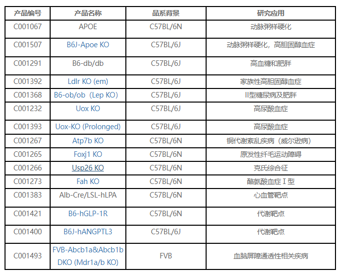 前面提到,目前动脉粥样硬化模型以Apoe和Ldlr敲除为主,除B6J-Apoe KO外,赛业生物还构建了Ldlr KO (em)小鼠用于动脉粥样硬化及高胆固醇血症等疾病研究。同时,我们还可提供B6-ob/ob(Lep KO)、Uox-KO (Prolonged)、Atp7b KO、Foxj1 KO等多类型代谢相关基因编辑模型,助力新药研发。