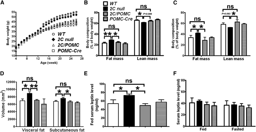 HTR2C-KO小鼠(2C null)体重和脂肪比例增加[10]