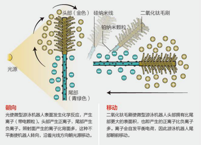 十年来,科学家一直梦想着发明一种能在血管中游动的微型机器人,用来递送药物或进行微型手术。过去 15 年里,研究人员已经发明了多种微型机器人,它们依赖化学反应、磁力或振动提供能量,但这些微型机器人经常无法稳定运行。香港大学的化学家唐晋尧(Jinyao Tang)说,最大的挑战是如何引导微型机器到达指定地点。唐晋尧和他的团队已经在这方面取得了进展,他们的微型游泳机器人可以在光的控制下平稳、精准地行进。这项研究已经发表在了 2016 年 12 月的《自然·纳米技术》杂志上。研究人员用硅作“手柄”,二氧化钛作“刷头”,构建了瓶刷形状的微颗粒。这两种材料都会吸收光子,当有光线照射,“手柄”会产生氢氧根负离子,“刷头”则产生氢正离子。离子会自发移动,以平衡电荷,它们带动周围的液体,使微型机器人“手柄”在前,像飞镖那样朝着光源游动。